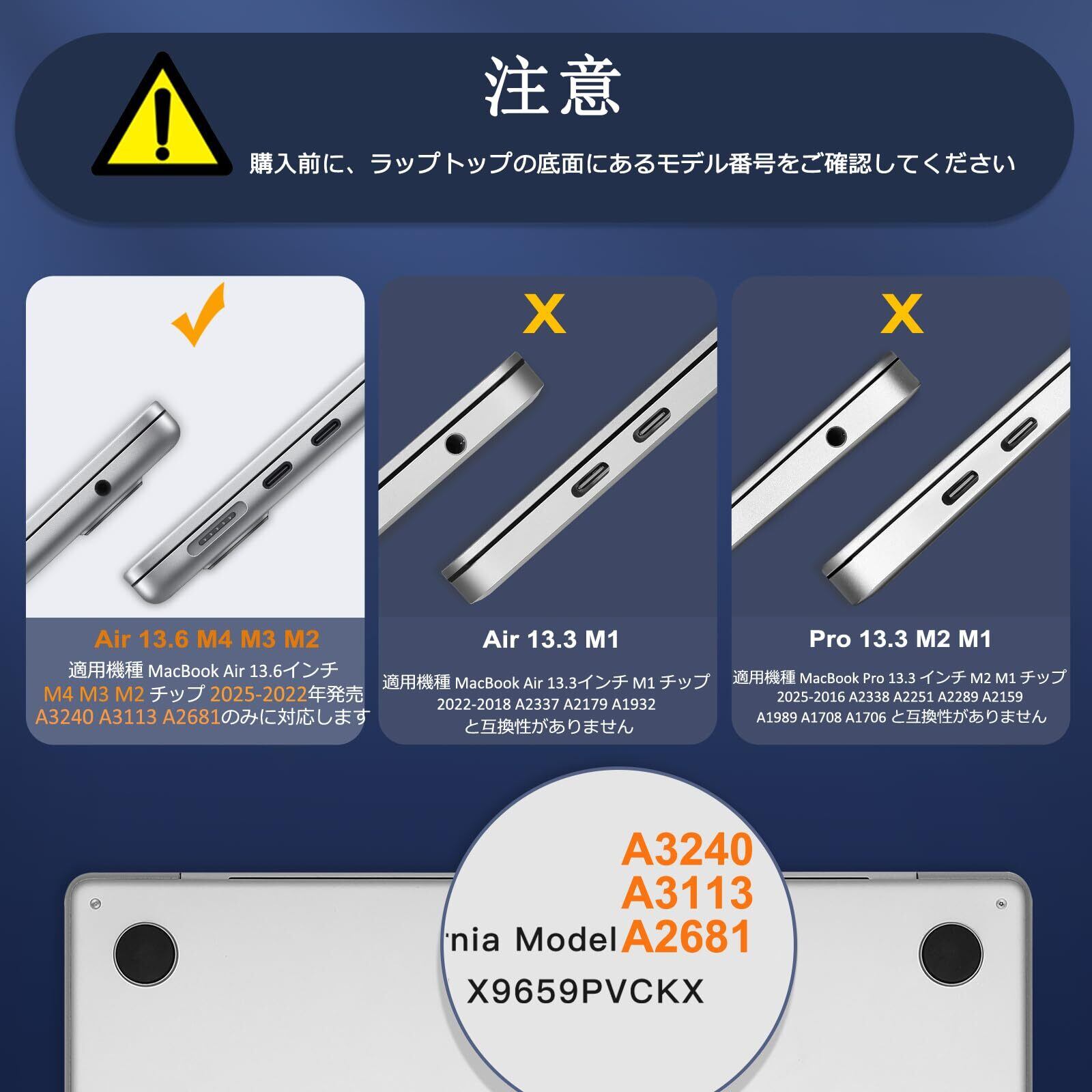対応機種 MacBook Air 13.6インチ M4 M3 M2 チップ Liquid Retina Display & Touch ID付き 2025 2024 2023 2022リリース(モデル: A3240 & A3113 & A2681)のみ対応します。注意:このケースは他のモデルのラップトップと互換性がありません。