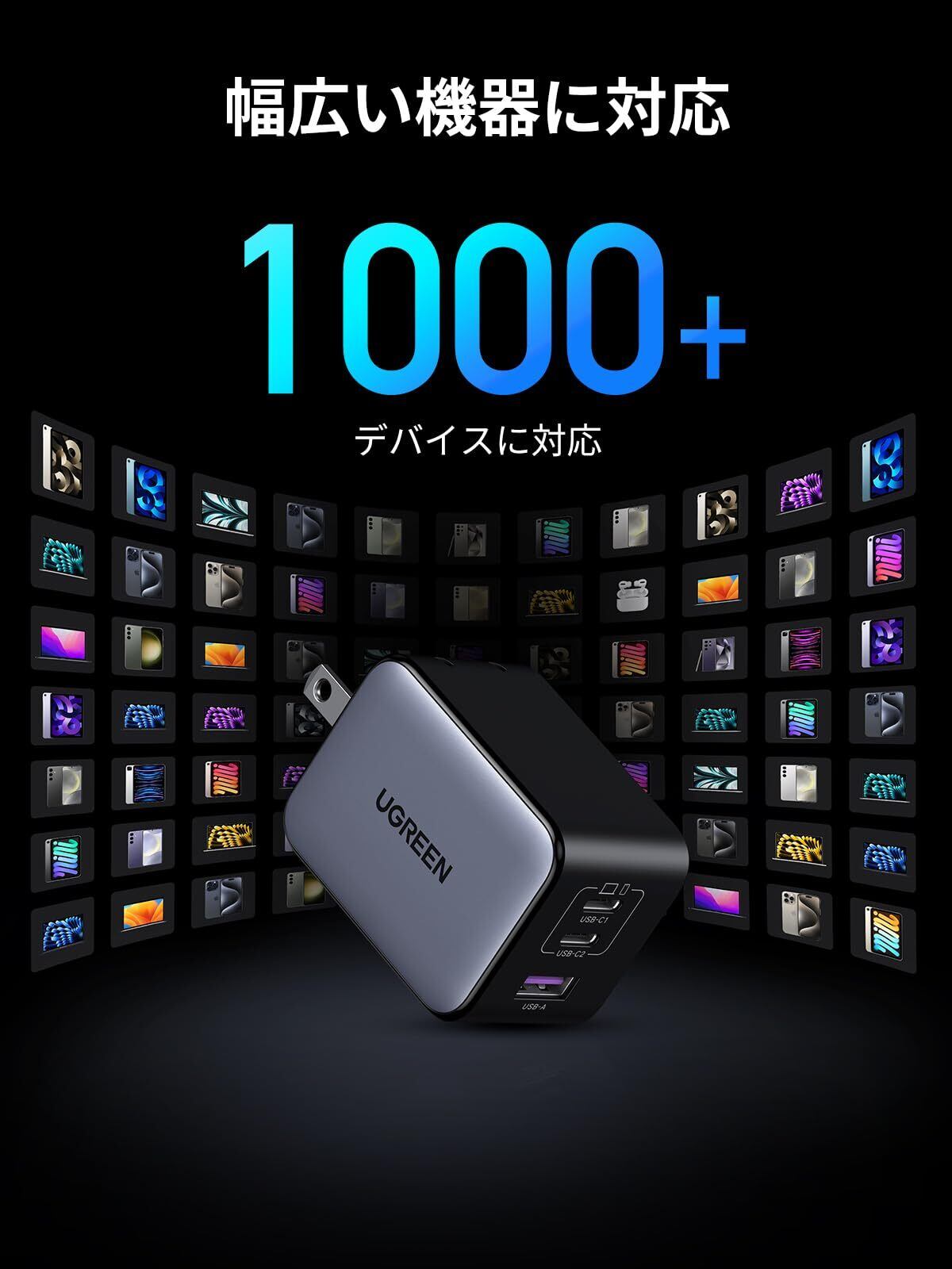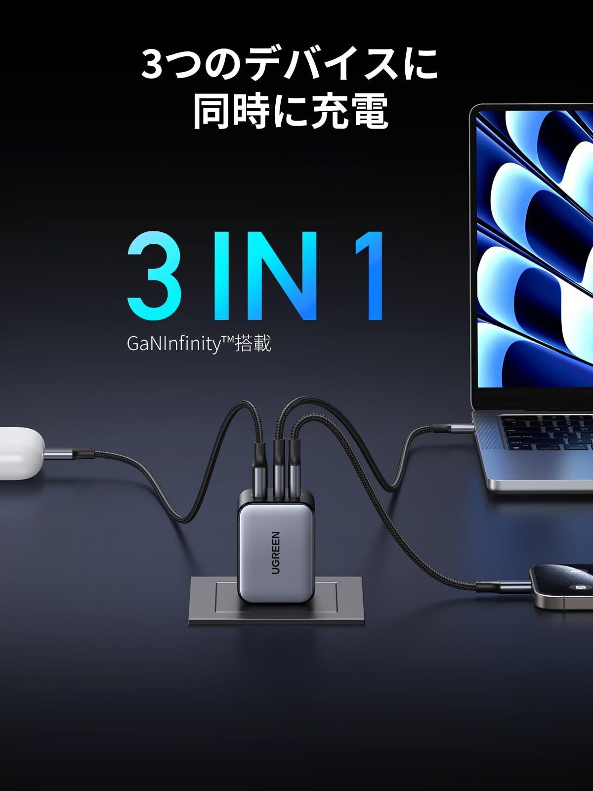 【3台のデバイスを同時に充電】 2つのUSB-Cポートと1つのUSB-Aポートを搭載し、最大3台のデバイスを同時に充 電で きます。合計で最大65Wの給電が可能なため、スマートフォ ンやスマートウォッチ、タブレット、ノートパソコンなどを急いで充電したいときに便利です。 .