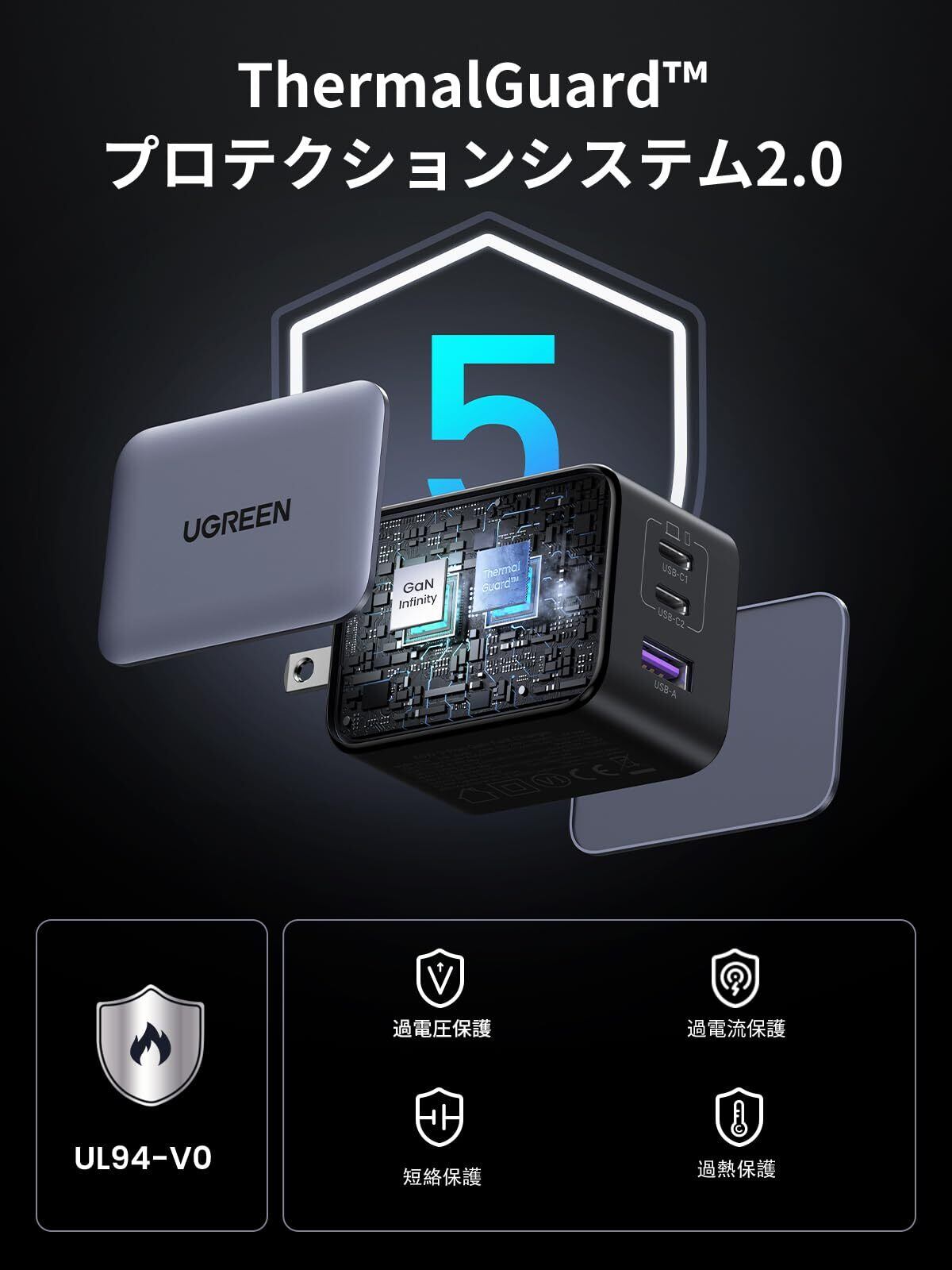 【独自の温度検知/制御技術 Thermal Guard】UGREENの独 自の温度検知/制御技術Thermal Guardは、ミリ秒単位の温度検出により過熱、過充電、過電流を制御します。温度変化をリアルタイムで検知し、適切な電流をデバイスにスマートに分配することで、デバイ スのバッテリー寿命の劣化を防ぎながら安心の高速充電を実現します。シェルは耐火性および難燃性に優れた高級PVC素材を採用、落下による衝撃から保護します。 .