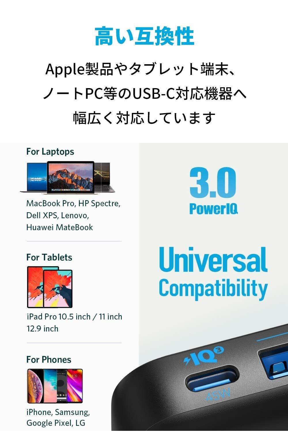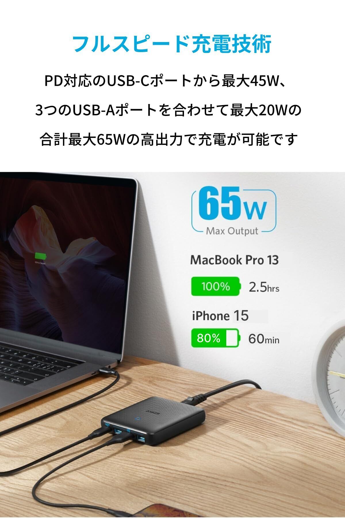 幅広い対応機種:Apple製品、タブレット端末、ノートPCなどのUSB-C対応機器にも対応。合計最大65Wの高出力で、多種多様な機器に急速充電が可能です。