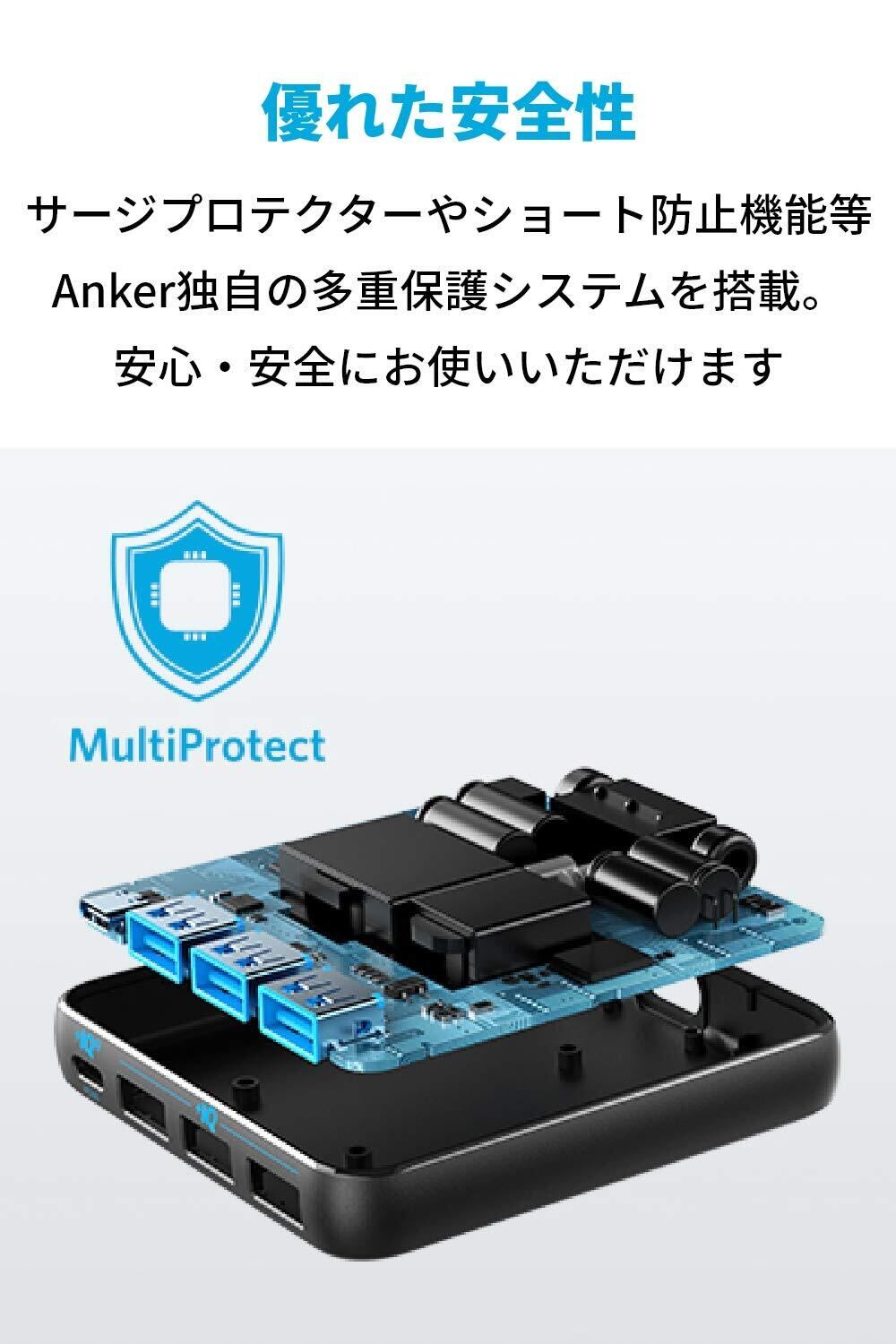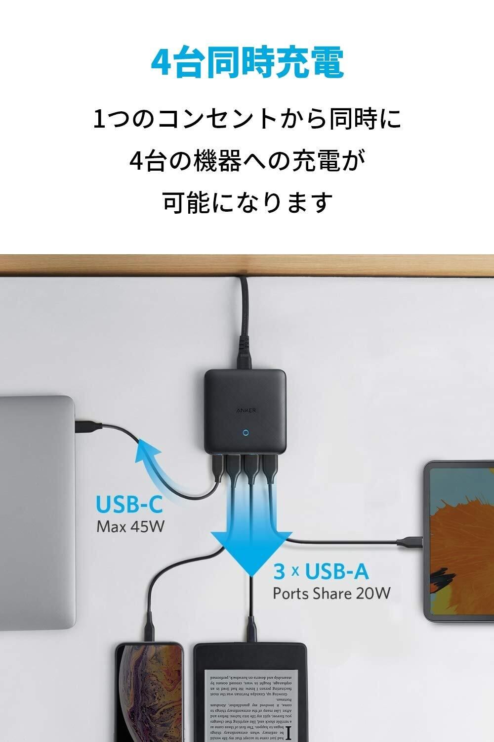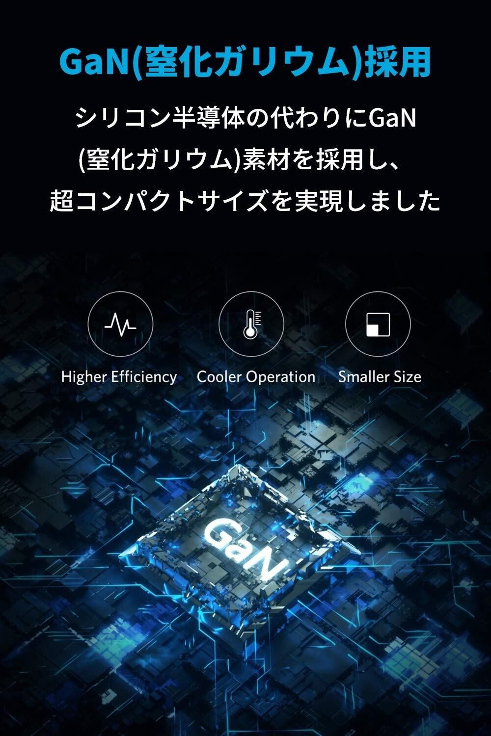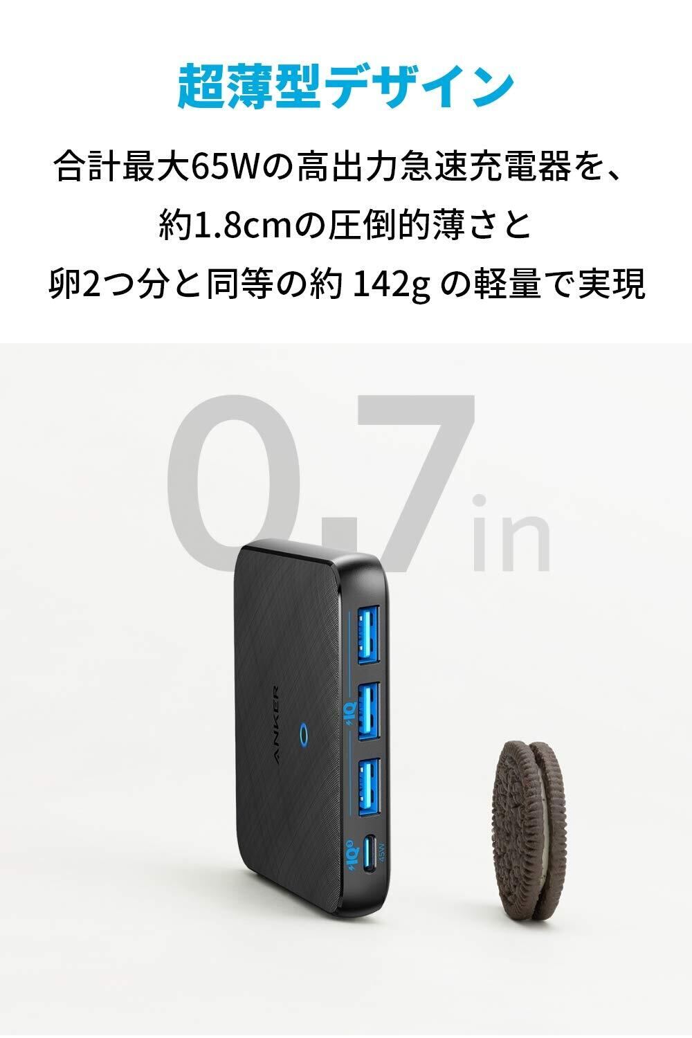 超薄型デザイン:人工衛星等の産業用機械に用いられていた次世代パワー半導体素材「GaN」の採用により、合計最大65Wの高出力ながらAnkerの4ポート急速充電器の中でも最薄レベルの超薄型デザインを実現しました。