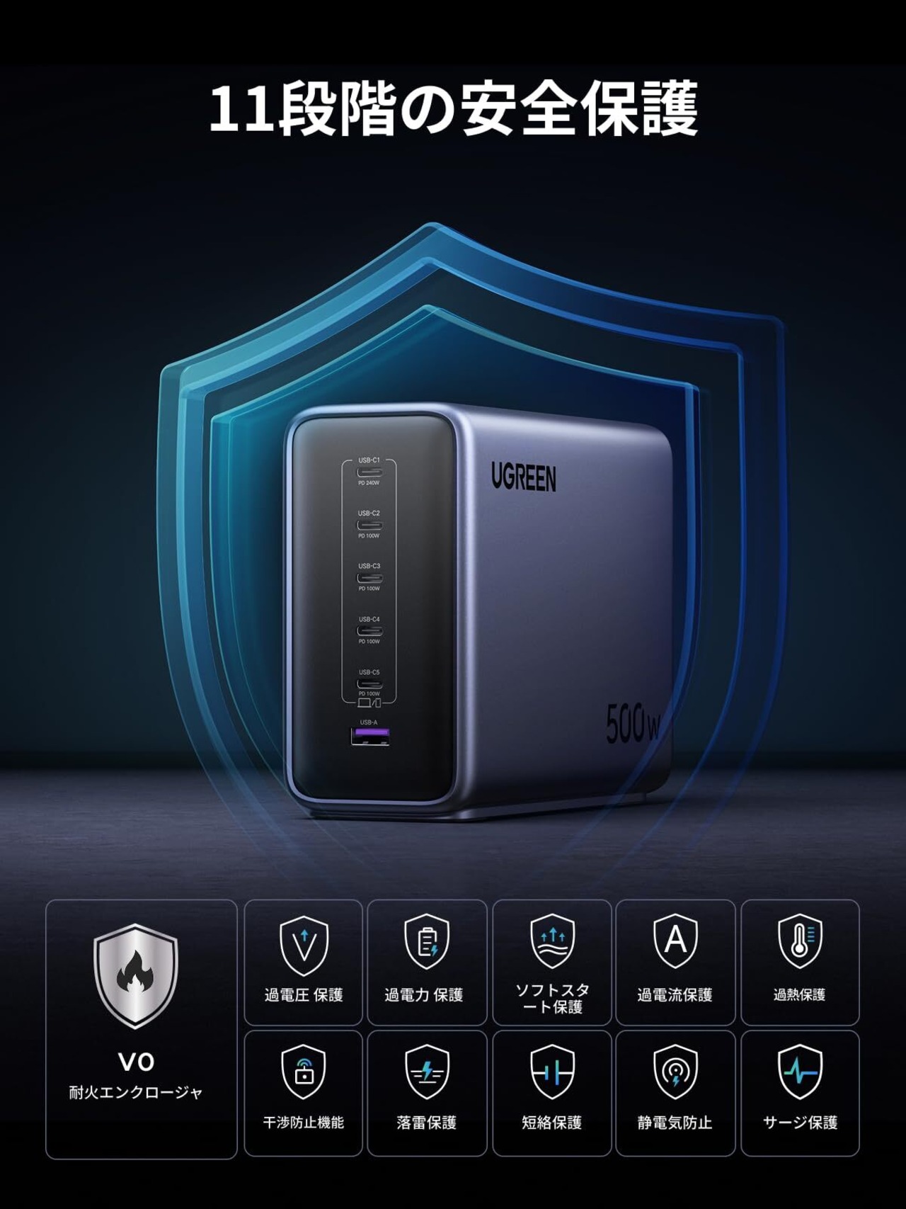UGREEN 500W 充電器 type-c 卓上 急速【単ポート最大240W 高出力】GaN PD3.1 240W 6ポート:5×USB-C 1×USB-A 6デバイス同時急速充電 スマホ/PC/パソコン/ipad/macbookに対応 2mの電源ケーブル付き PSE技術基準適合 X759 iphone17シリーズ