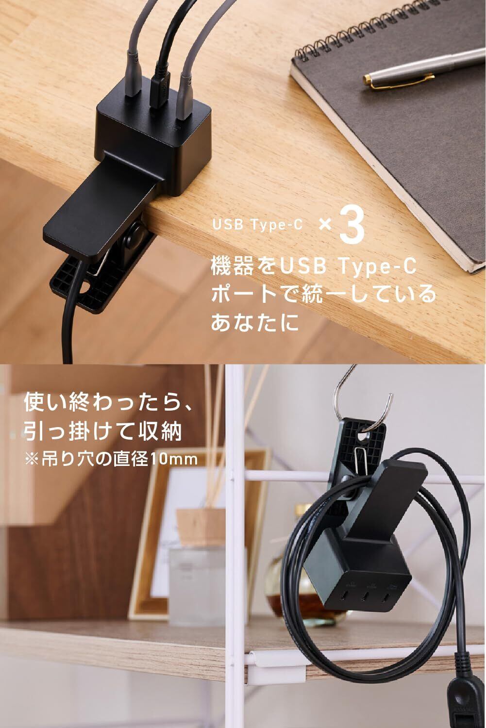 机などに挟んで使えるクリップ機構を搭載した、USB Type-C(TM)ポート付きのAC充電器です。