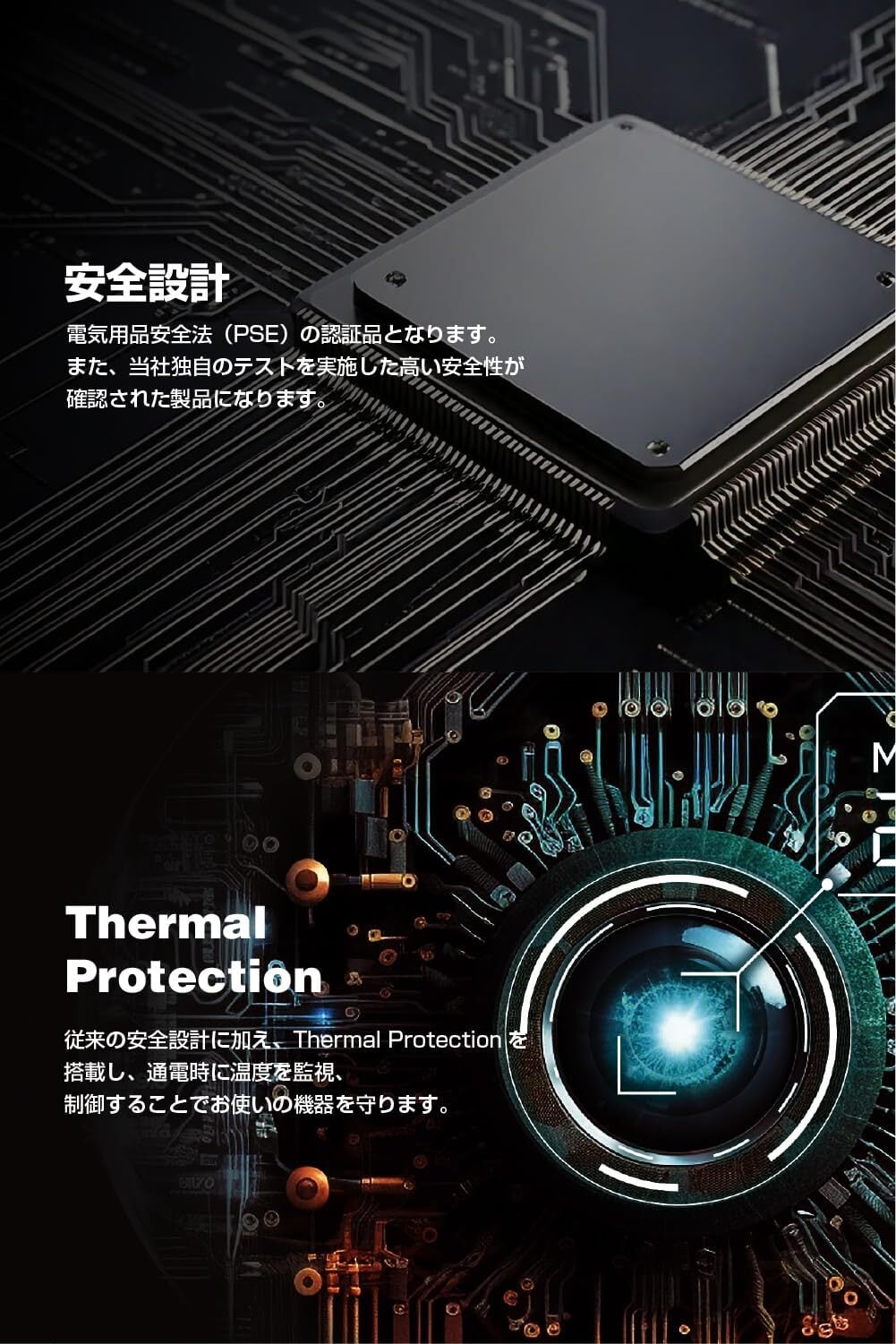■従来の安全設計に加え、Thermal Protectionを搭載し、通電時に温度を監視、制御することでお使いの機器を守ります。