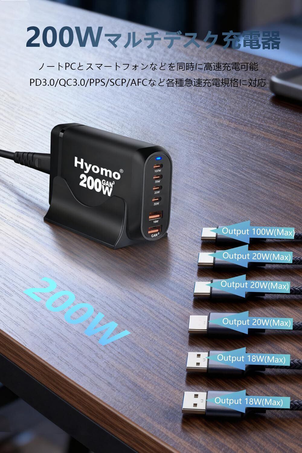 200W GaNFastⅢ 充電器 6ポート 単口最大100W 【PSE技術基準適合】PD3.0対応 4USB-C&2USB-A