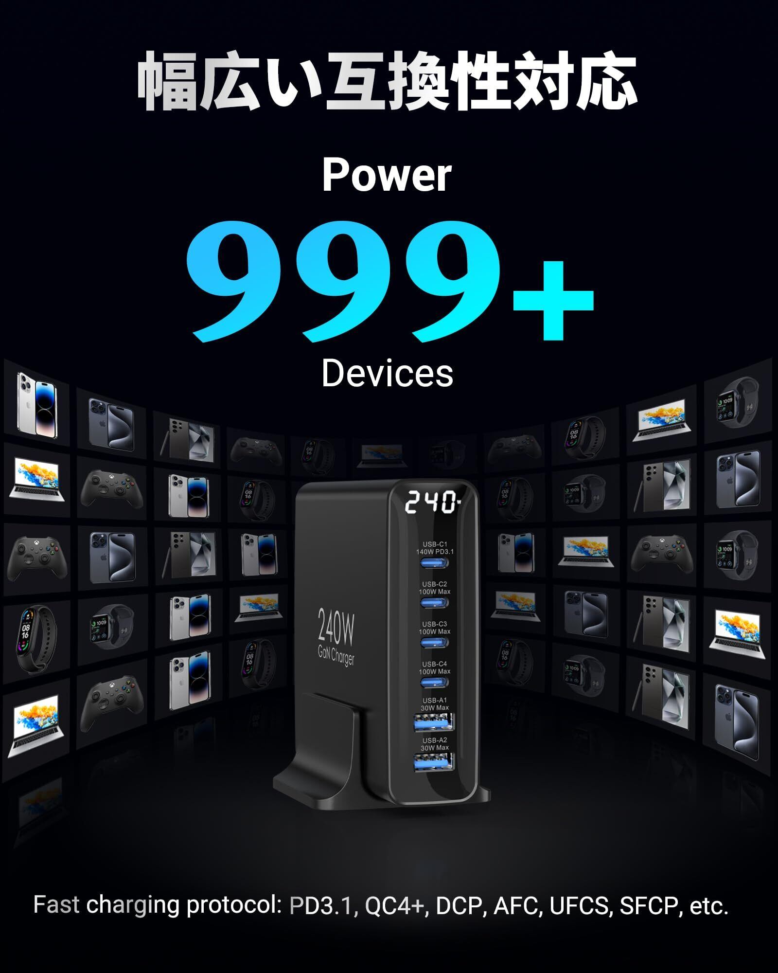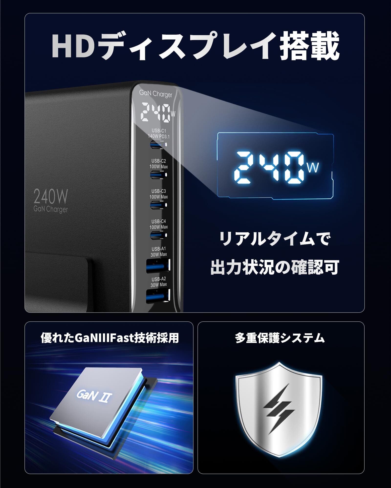 240w 充電器 PD3.1対応 6ポート同時急速充電【C1 単ポート140W MAX/ディスプレイ搭載 /1.5mケーブル付】USB コンセント GaNFastⅢ 対応 PCに急速充電対応 MacBook Pro14”/16” 対応 Macbook M4/iPad Pro/iPhone 16/15/Galaxy/Android/その他 (ブラック)