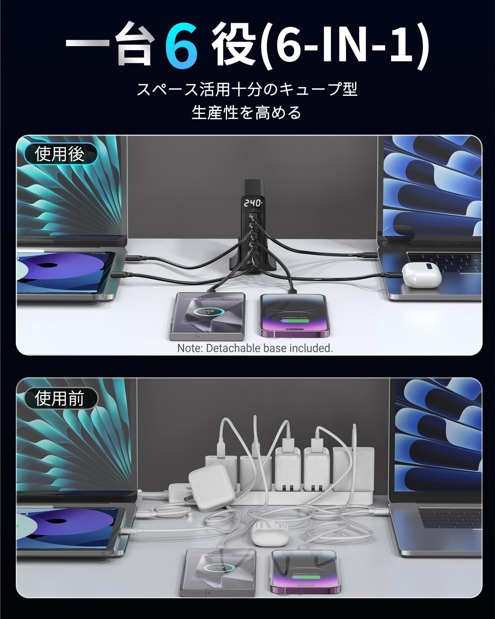 【GaN充電器多重保護・PSE認証済み・高級PC素材採用】当社の充電ステーションは次世代GaN技術を採用し、PSE認証済み、従来製品と同じ多重保護システムに加え、GaNIII技術により優れた安全性を実現。独自の温度管理と接続端末の保護システムでお使いの機器を24時間守ります、就寝時やお子様やペットがいるご家庭でも24時間安全にご利用いただけます。このAC アダプター type-c は40dB未満(図書館並みの静音性)の超静音設計のため、夜間充電でも睡眠を妨げず。高級 PC 素材を採用することで、耐熱性・耐衝撃性を確保し、長寿命化を実現しています。
