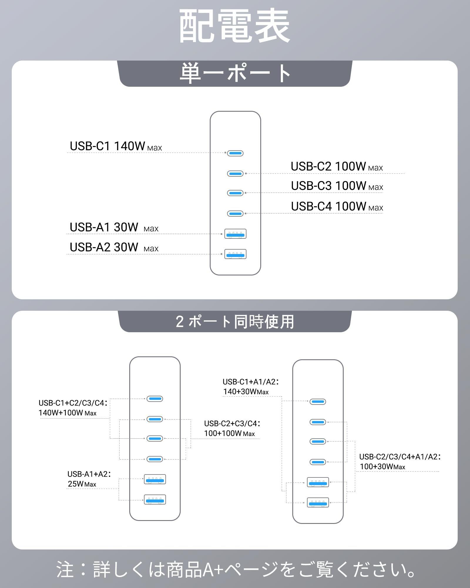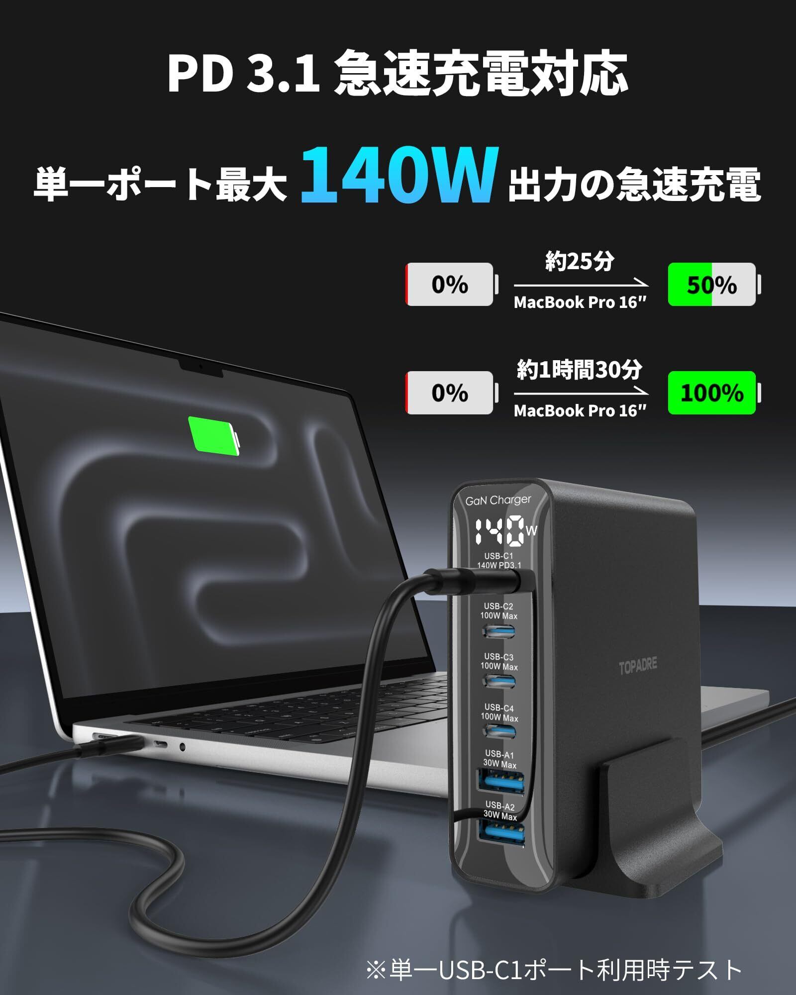 【USB充電器 6ポート・240W急速充電器】TOPADREはハイパワーACアダプター充電器の専門メーカーです;4×USB-C(C1:140W MAX ・ C2/C3/C4:100W MAX)+ 2×USB-A(A1/A2:30W MAX)ポート搭載、1*1.5M*100W USB Cケーブルが付属しており、多デバイス同時急速充電で充電時間を大幅短縮する卓上充電器。16インチのMac Book Proをわずか30分で50%まで充電することが可能です(140W MAX出力時は必ずUSB-C1ポートと140W対応Type-Cケーブルをご利用ください)。注:複数デバイスを同時接続中に新たなデバイスを接続/抜去すると、充電器のスマート保護システムが作動し、電力配分を自動的に再設定します。この再設定プロセス中にポートの一時断電が発生しますが、充電は自動的に速やかに復旧します。これはお客様のデバイスを保護するための、高出力・マルチポート充電器における正常な動作プロセスです。