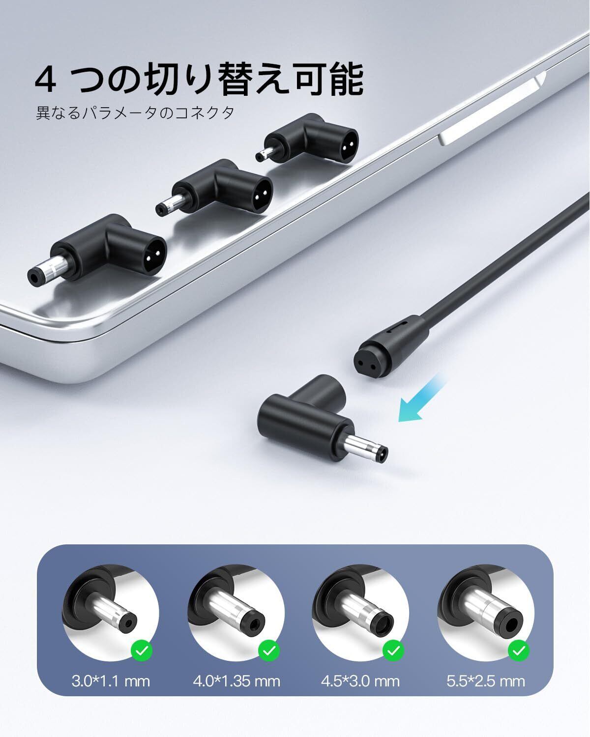 【商品情報】入力:100V-240V 出力:19V 3.42A ワット数:65W(19V 2.37A/1.75A 45W/33Wも対応)。 コネクタ:4.0*1.35mm、5.5*2.5mm、4.5*3.0mm、3.0*1.1mm DCジャック。 付属品:2.3 mACアダプター(1個)、サイズの異なる交換用コネクタ(4個)