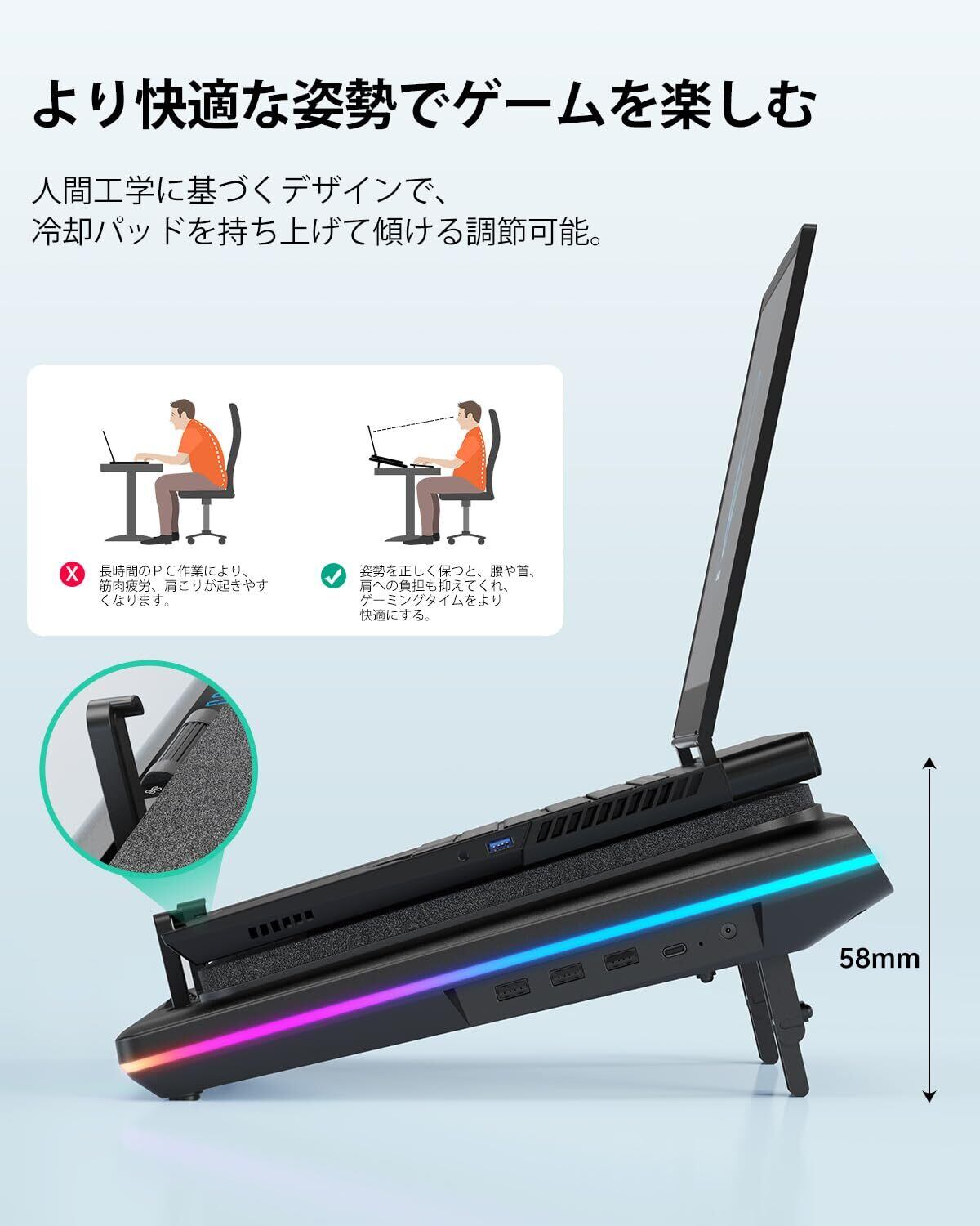 【角度調節可・15~19インチのPCに対応】人間工学に基づくデザインで、ノートパソコンスタンドとして、冷却ファンを持ち上げて傾ける調節可能。長時間のPC作業により、筋肉疲労、肩こりが起きやすくなりますので、お好きな高さを調整して、姿勢を正しく保ち、腰や首、肩への負担も抑えてくれ、ゲーミングタイムをより快適にしましょう。汎用性が高いpc クーラーはAcer Nitro 5、MSIなど15〜19インチまでいろんなノートパソコンに対応可能。