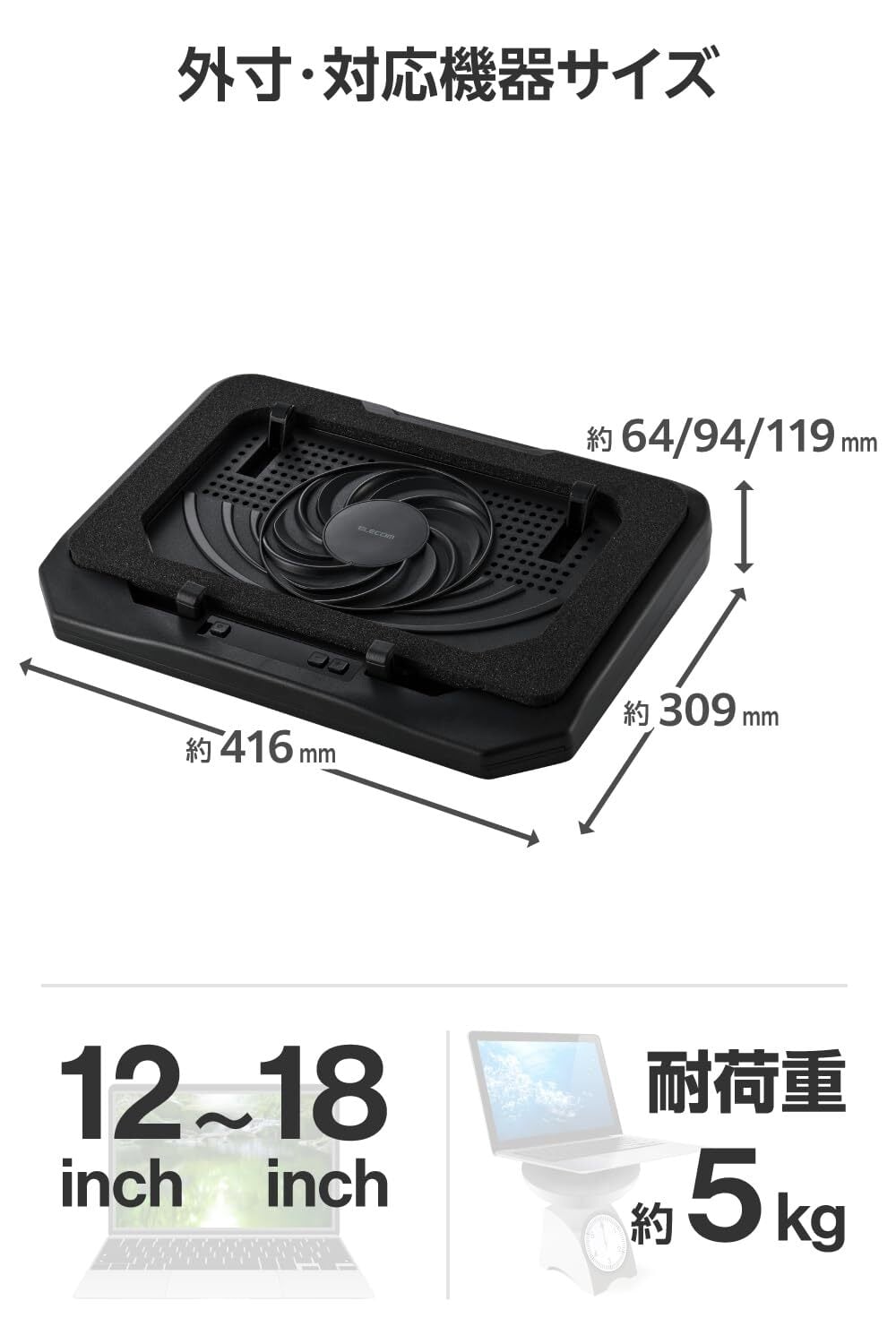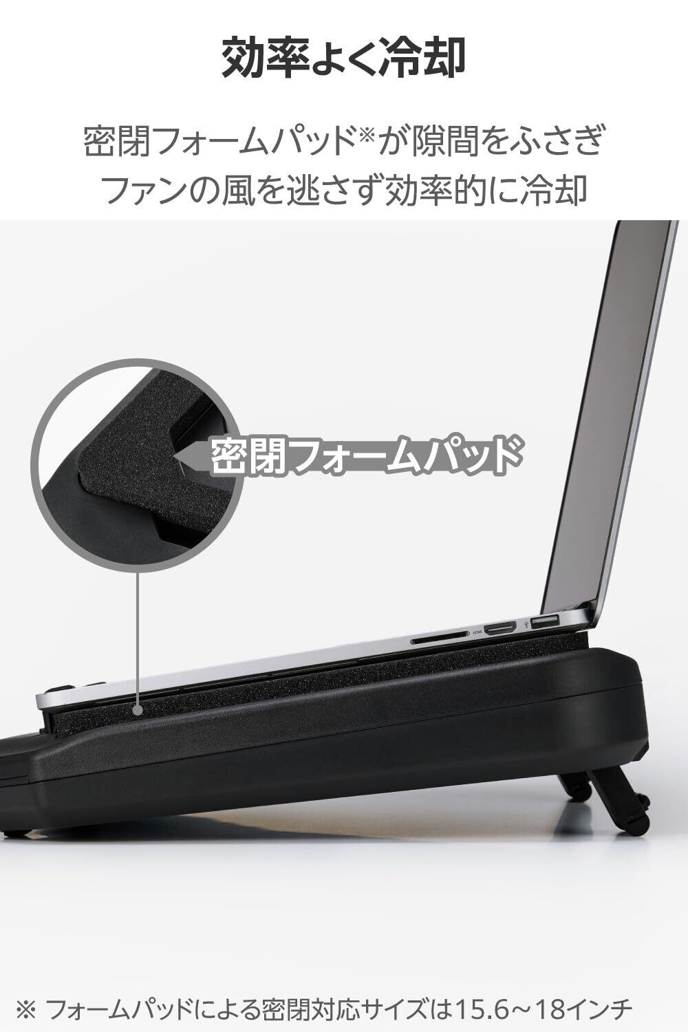 15.6~18インチのノートパソコンは、クッション性のある密閉フォームパッドが隙間をふさぎ、ファンの風を逃さず効率的に冷やします。