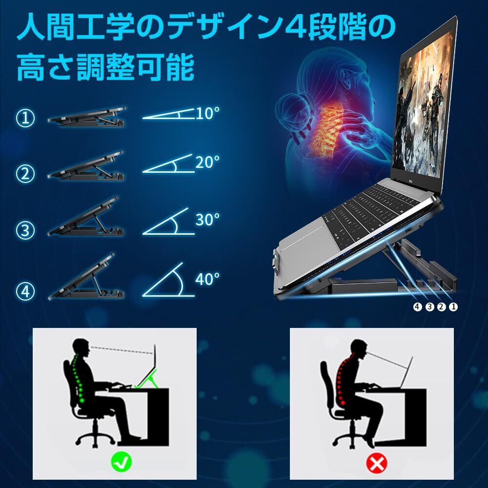 【4段階高さ調整】人間工学に基づいて、4段階の高さ調整できます。サイズは37*26*2.5cmで、9*16インチまで様々なノートパソコンに対応可能。ノートパソコンの角度を0~40°まで、デスクワークでの姿勢を矯正し、肩周りの凝りを減らせ、首と背中の痛みや目の疲れを防げます。