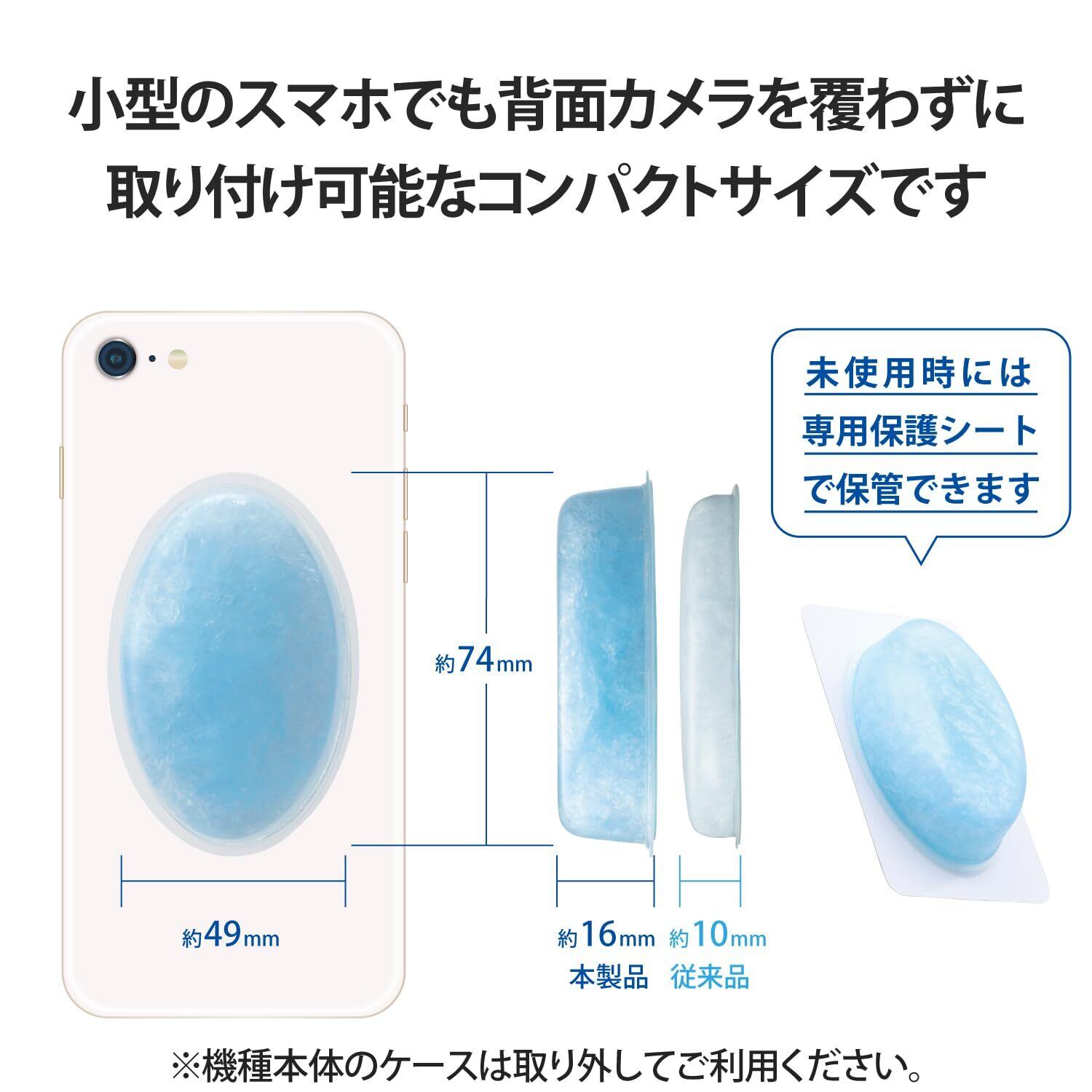 ■W約49mm×H約74mmで、小型のスマートフォンでも背面カメラを覆わずに貼り付けできるコンパクトサイズです。