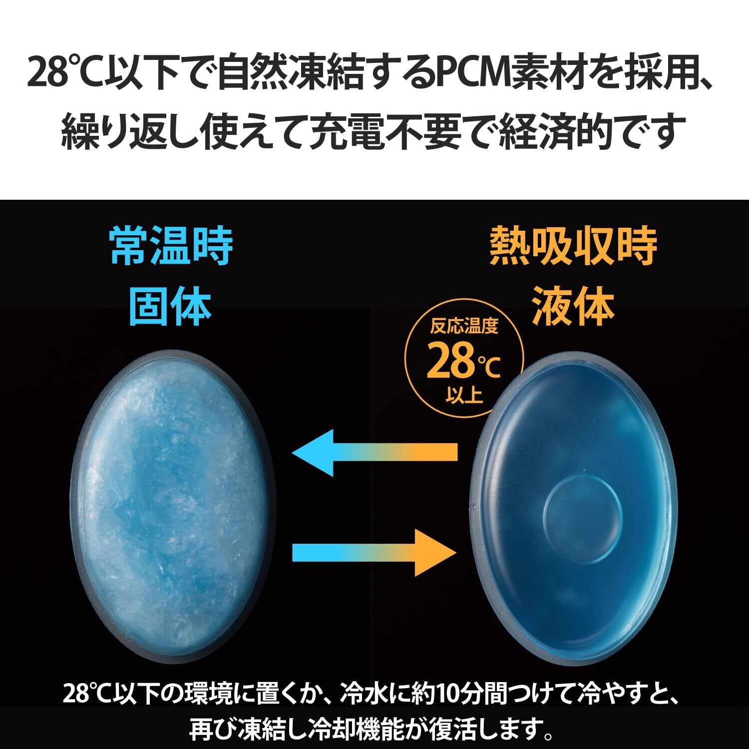 ■28℃以下で自然凍結するPCM素材を採用しています。溶けて液体になった場合は、28℃以下の環境に置くか、冷水に約10分間つけて冷やすと、再び凍結し冷却機能が復活します。繰り返し使えて充電が不要なので経済的です。 ※冷却時間は目安です。完全に凍結するまで冷やしてからご使用ください。