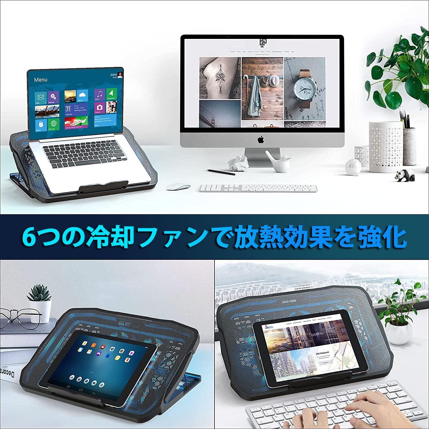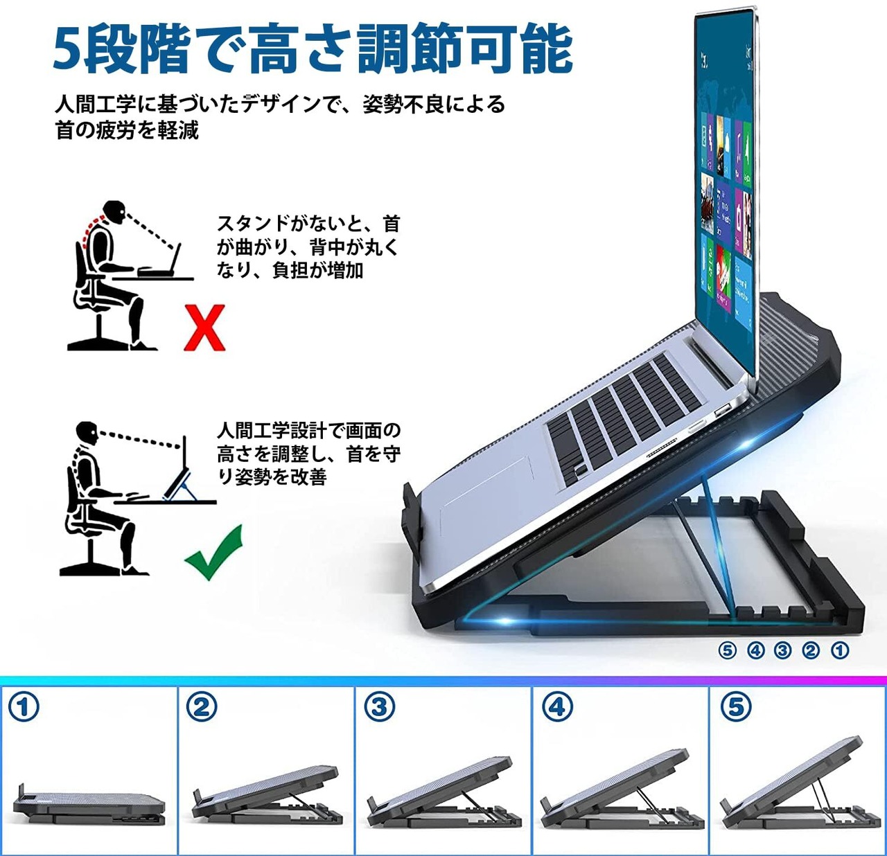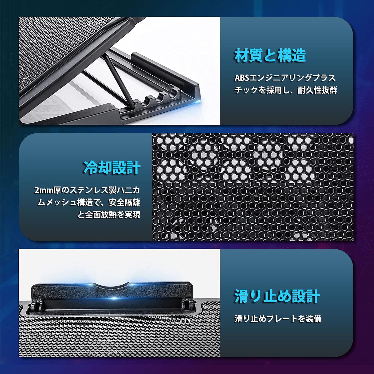 ノートパソコン 冷却パッド 冷却ファン ノートpc 冷却 ポータブルクーラー laptop cooling pad 冷却台 6つ冷却ファン搭載 5段階高度調整可 風量調節可 大風量・低騒音 2つUSBポート付 メタルメッシュデザイン 滑り止め付き ledストリップライト付 9-17インチまでのノートPC/Macbook/等に対応 オフィス/在宅勤務/出張などに適用