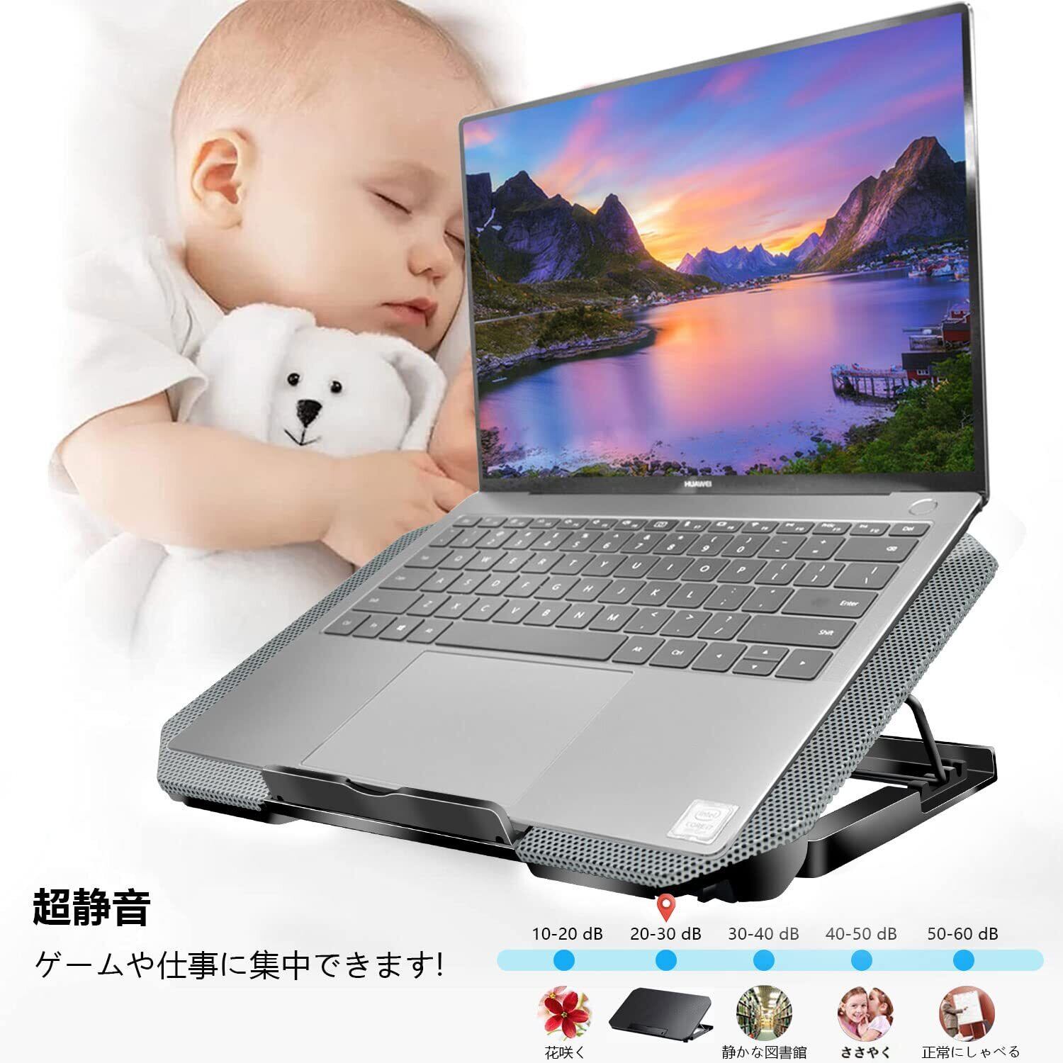 【20dp静音冷却ファン】静音設計のファンを採用しており、低騒音・高効率を実現したことで冷却力を維持しつつ静かな環境を提供します。シンプルな機能と共に風速調節機能を搭載し、音楽・仕事・ゲームなど、シーンによって必要な風量を調整できます。