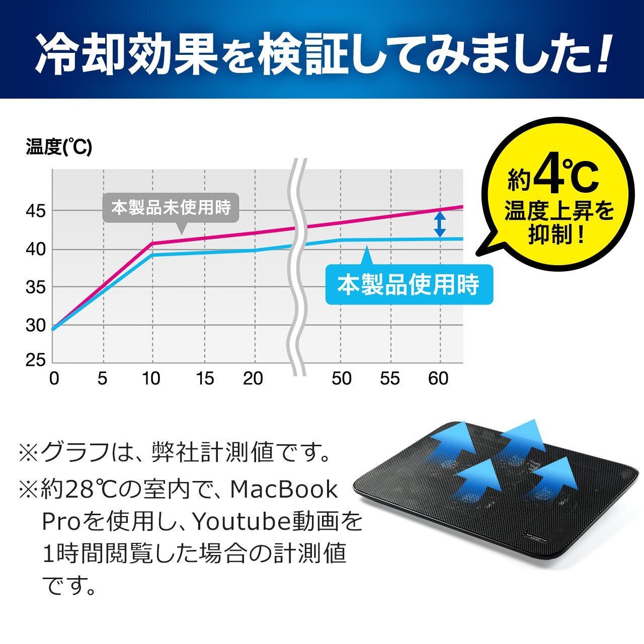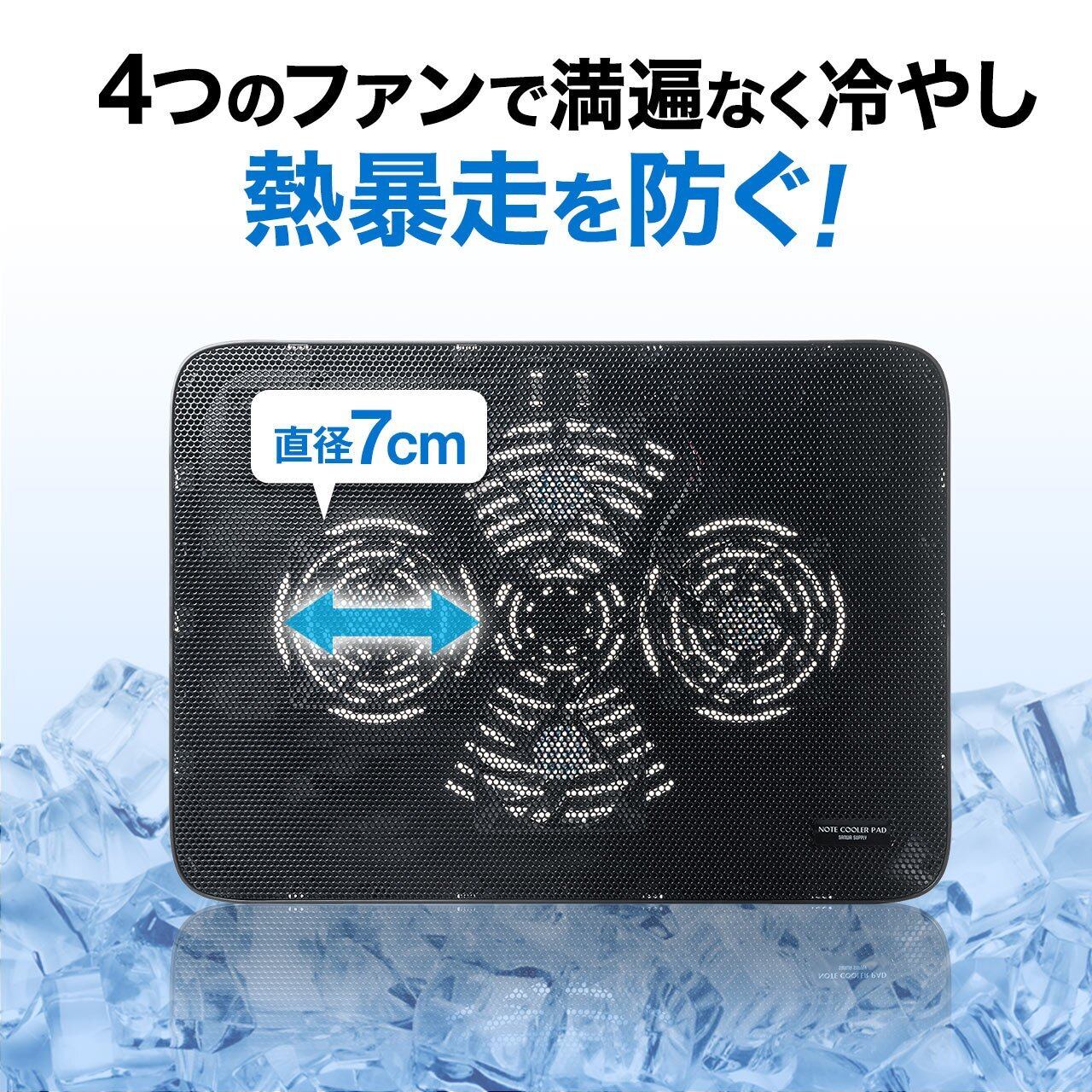 4つのファンでノートパソコンの熱暴走を防ぐ、ノートパソコンクーラーです。放熱性の高いメタルパネルを採用しており、パソコン底面にある吸排気口を塞ぎません。