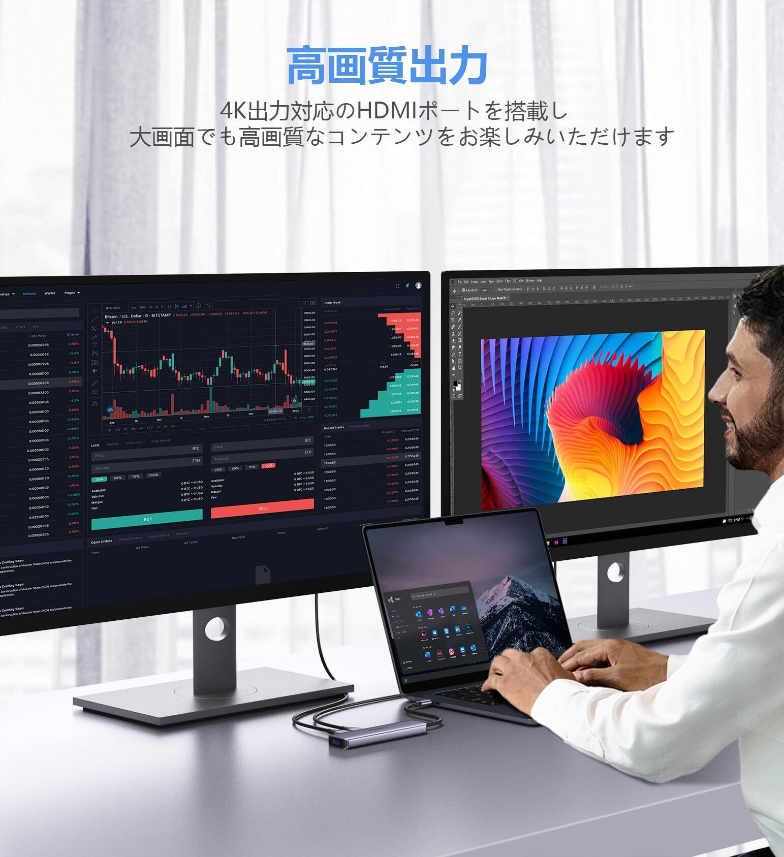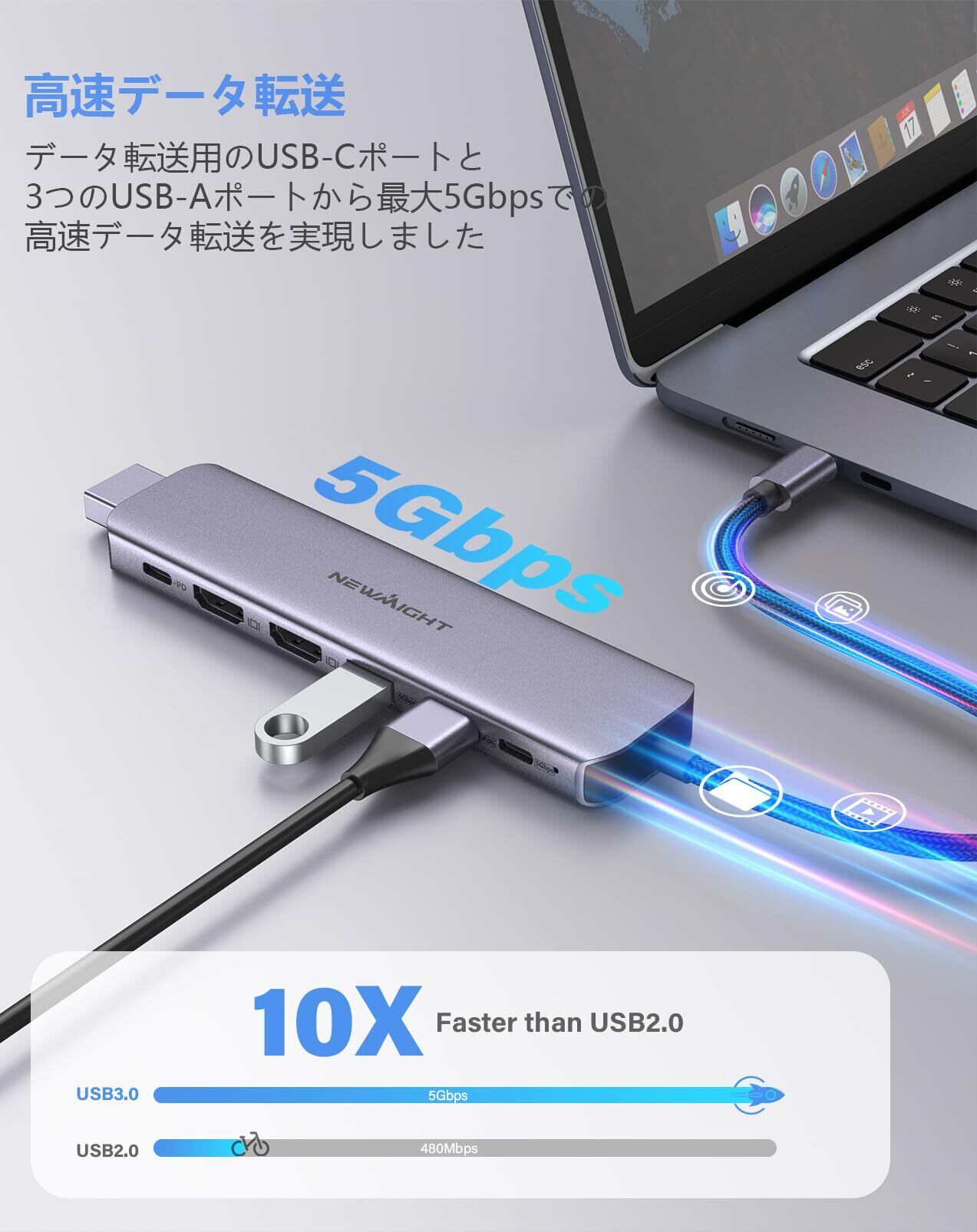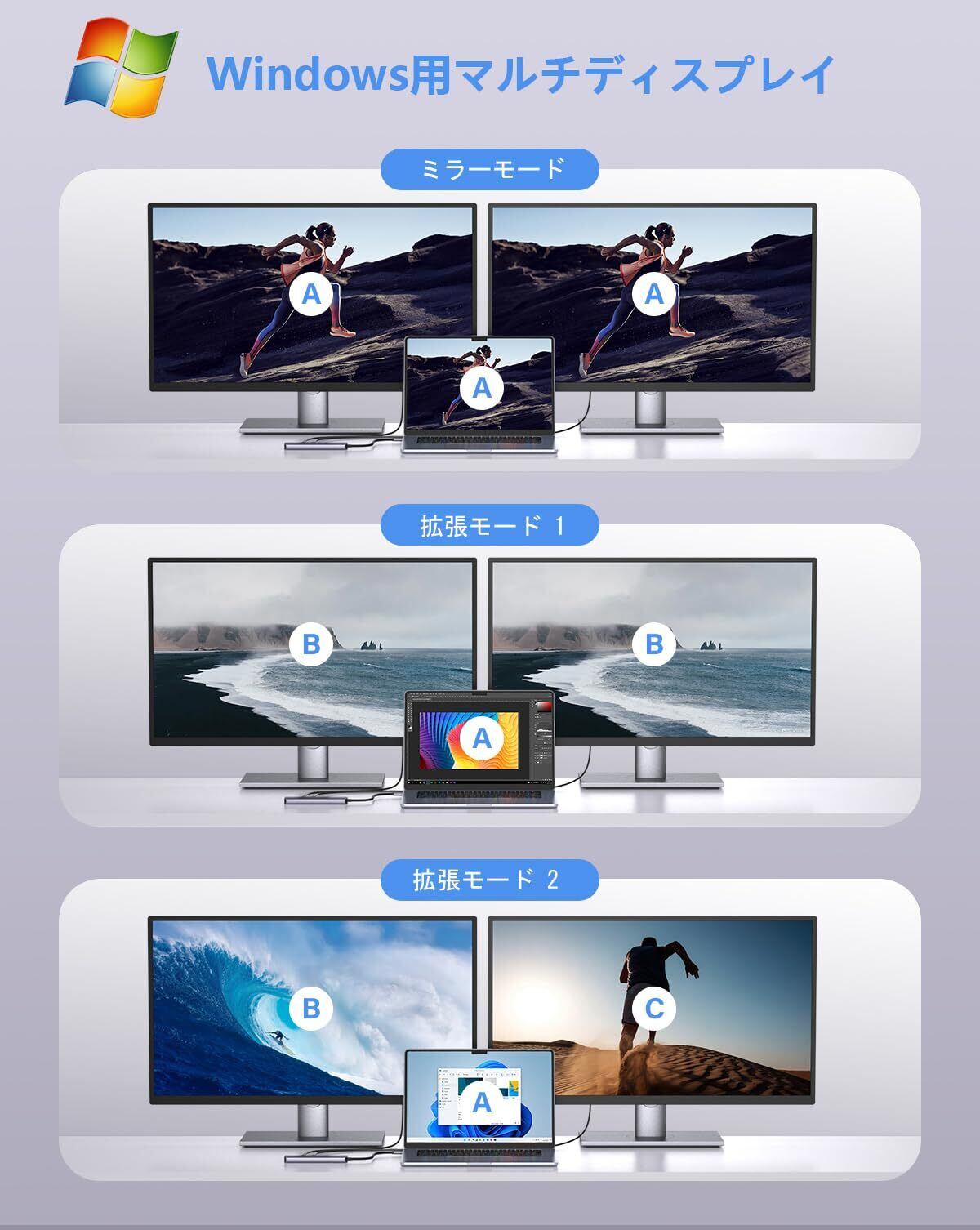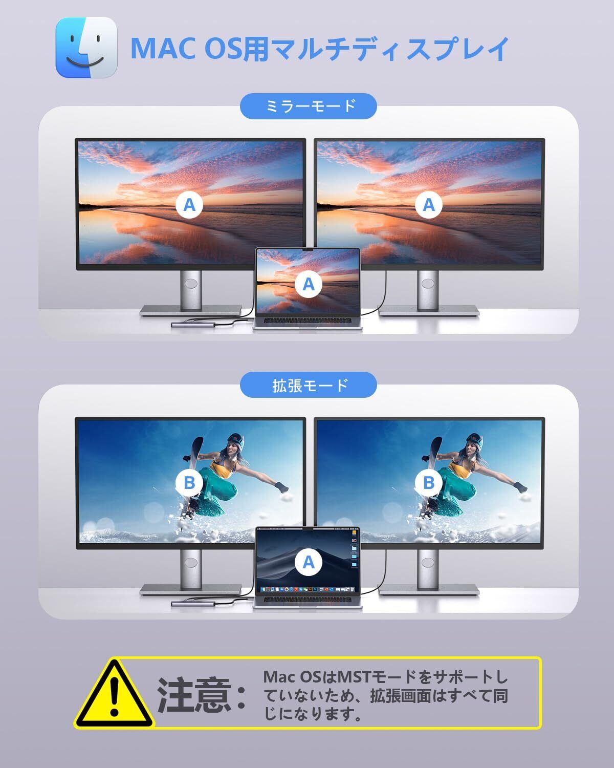【ご注意ください】本製品はデュアルHDMI同時出力時、最大解像度は1080Pとなります。シングルHDMI出力時は4K@30Hzに対応しています。解像度が正常に出力されない場合は、ドッキングステーションおよび接続機器が適切な電源アダプターを使用しているかをご確認ください。また、HDMI 2.0以上の高品質なケーブルのご使用、モニターが4K出力に対応しているかの確認もあわせてお願いいたします。