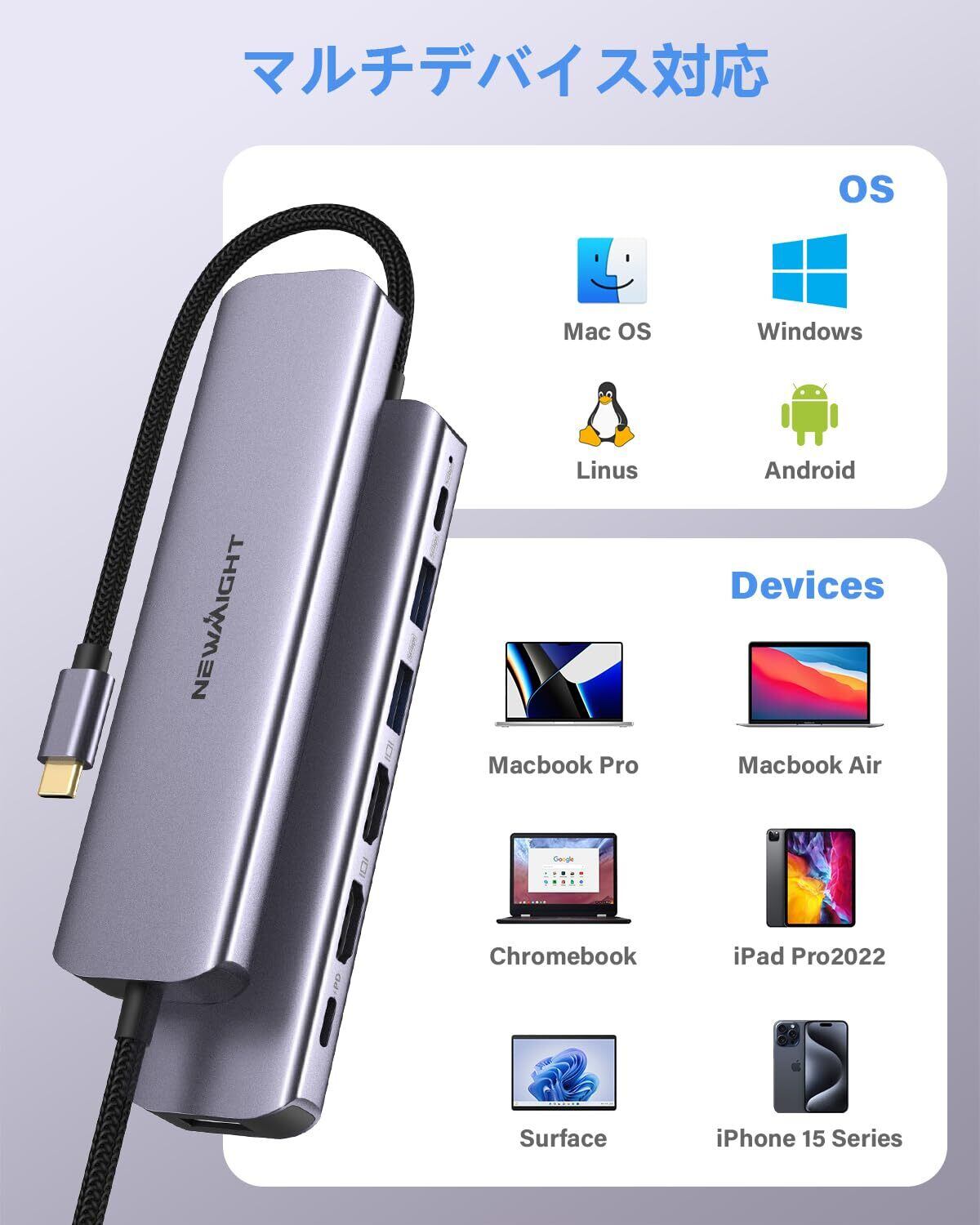 【幅広い互換性】このUSB C - デュアルHDMIアダプタは、MacBook Pro/Air(2023/2022/2021/2020/M1/M2など)、iPad Pro 2020/2021、2017年以降のiMacモデルなど、市販のThunderbolt 3搭載Type Cノートパソコンのほとんどに対応します。 iPhone 15シリーズ、Samsung Chromebook Pro、Dell XPS 13 15、Lenovo Yoga 900/910など、 HP Spetre X360、Surface Book2、Huawei P20 Pro、Google Chromebook Pixelなど。対応OS MAC OS、Windows、Linux、Andriod、IOSなど。(注:購入前に、Type-Cポートが動画出力に対応しているかをご確認ください。)