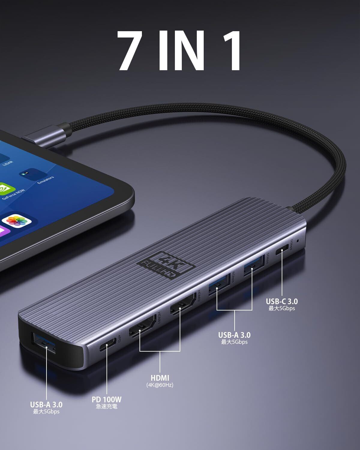 USB ハブ USB-C ドッキングステーション 7-in-1 Type-C ハブ 4K60Hz HDMI×2・USB 3.0×4・PD100W充電対応・デュアルモニター出力・高速データ転送・安定動作・MacBook Air/Pro, Dell XPS, iPad Pro対応
