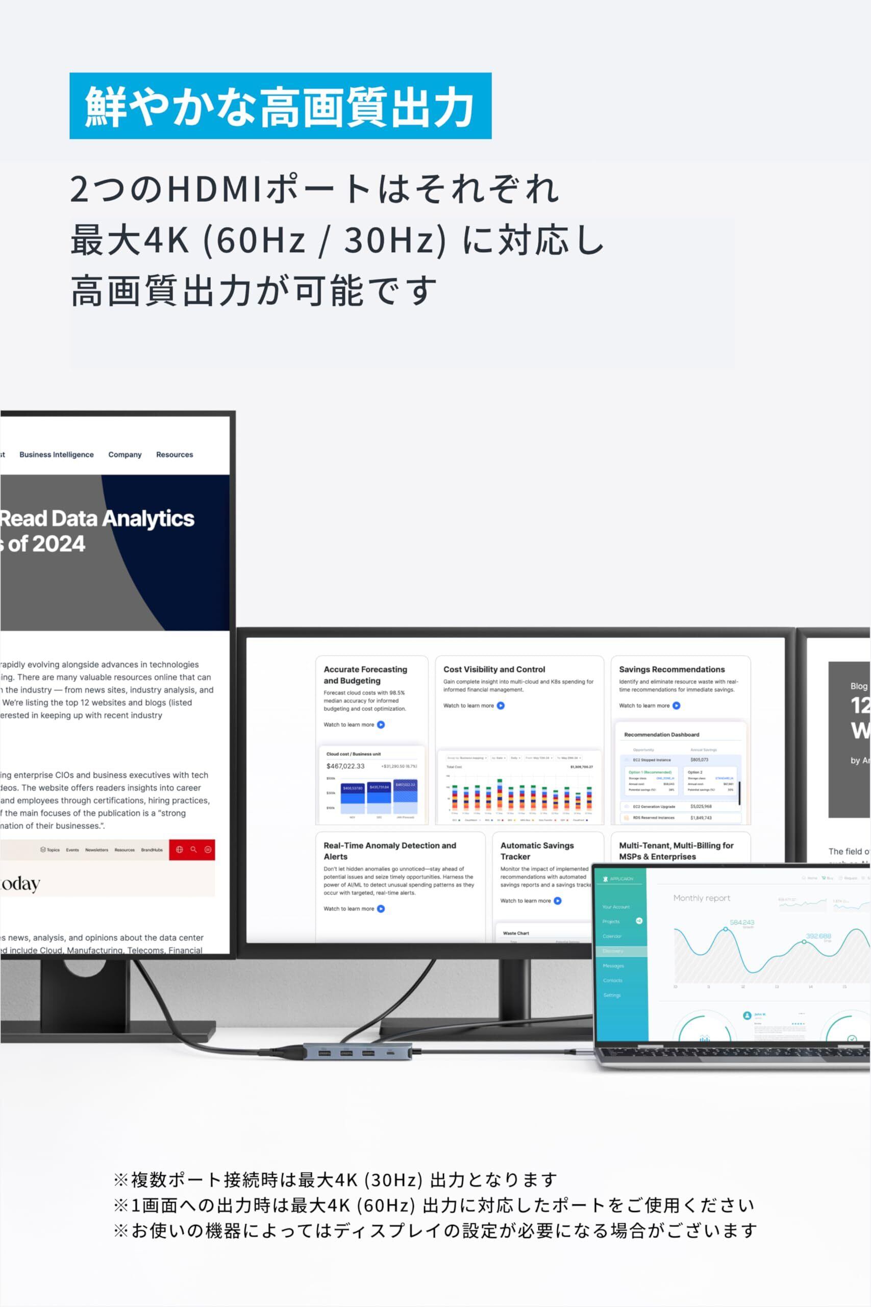 鮮やかな高画質出力と最大3画面出力が可能:VGAポートと2つのHDMIポートを使用して最大3画面でコンテンツをお楽しみいただけます。2つのHDMIポートはそれぞれ最大4K (60Hz / 30Hz) に対応し高画質出力が可能です。