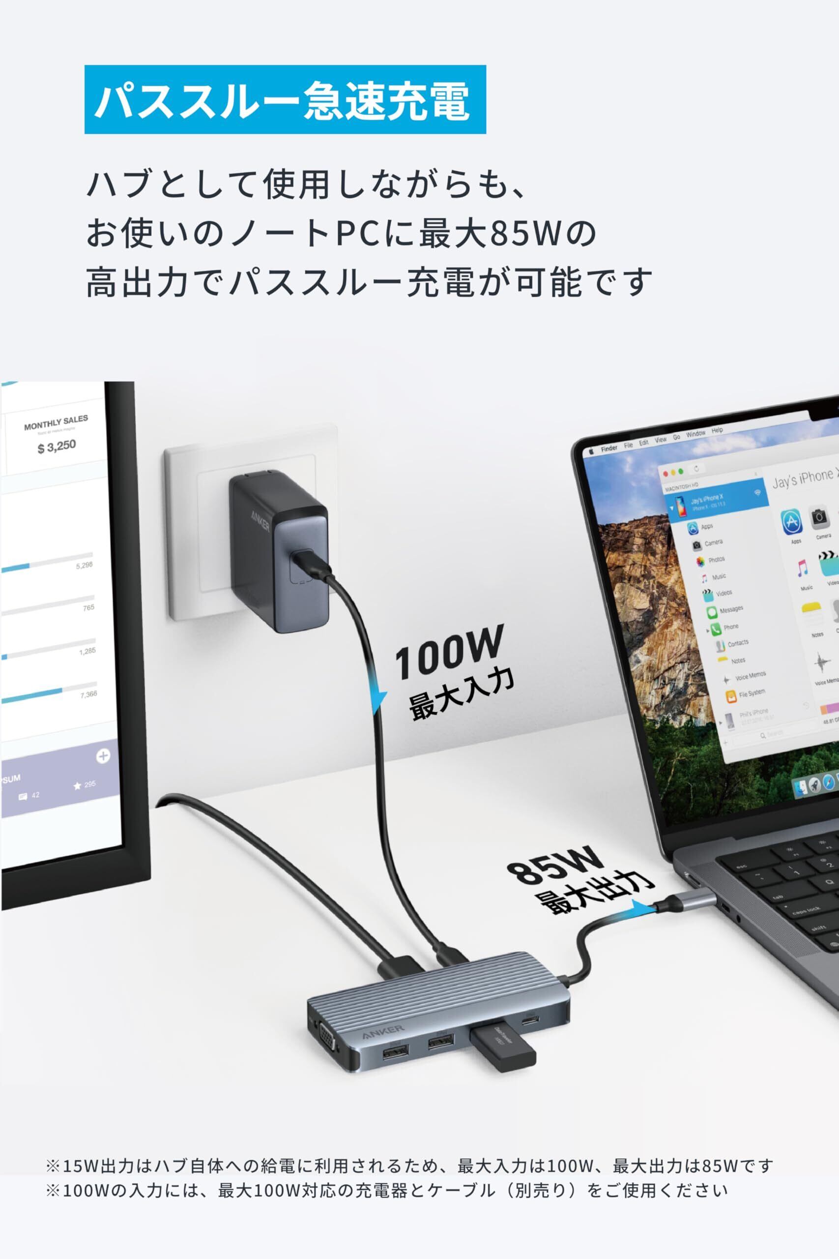 パススルー急速充電:ハブとして使用しながらも、お使いのノートPCに最大85Wまでの高出力でパススルー充電が可能です。