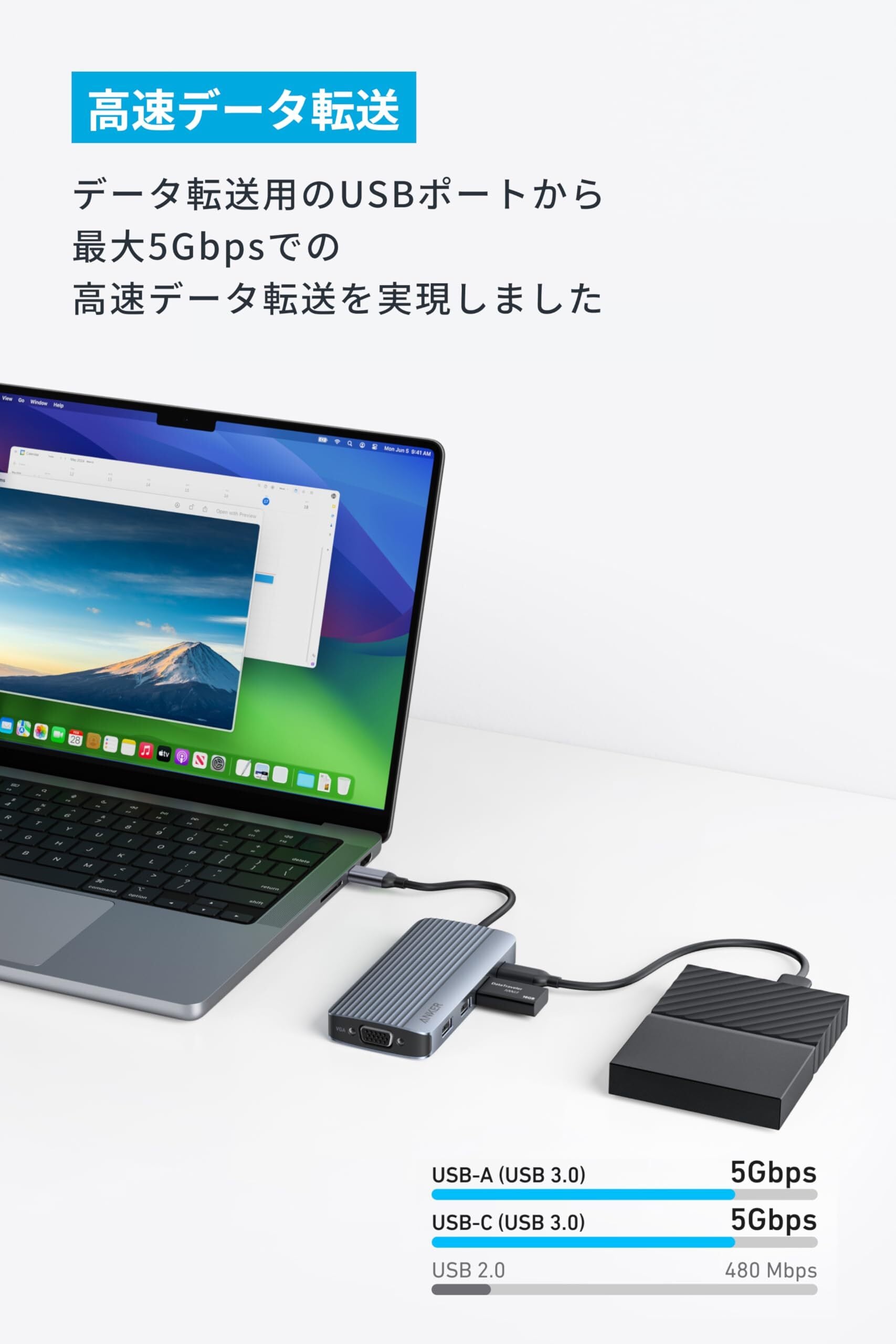 高速データ転送:データ転送用のUSBポートから最大5Gbpsでの高速データ転送を実現しました。