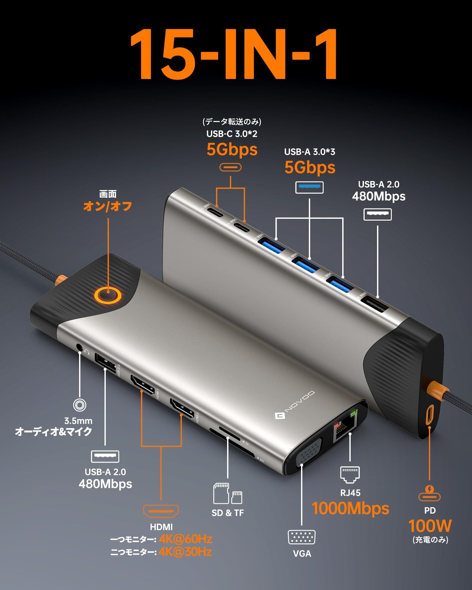 15-in-1 USB C ドッキングステーション: NOVOO USB C HDMI ハブは、デュアル4K HDMIポート、USB-C 3.0データポート(最大5Gbps)、USB C PD100W充電ポート、USB-A 3.0ポート(3つ)、USB-A 2.0ポート(2つ)、ギガビットRJ45イーサネット、VGA、SD/Micro SDカードリーダー、3.5mmオーディオ/マイクポートを備えた多機能ハブです。プラグ&プレイ対応で、さまざまなニーズにお応えします。ご注意: 注文する前に、ラップトップのType CソースポートがThunderbolt 3/Thunderbolt 4/DP Alt モードをサポートしていることを確認してください。