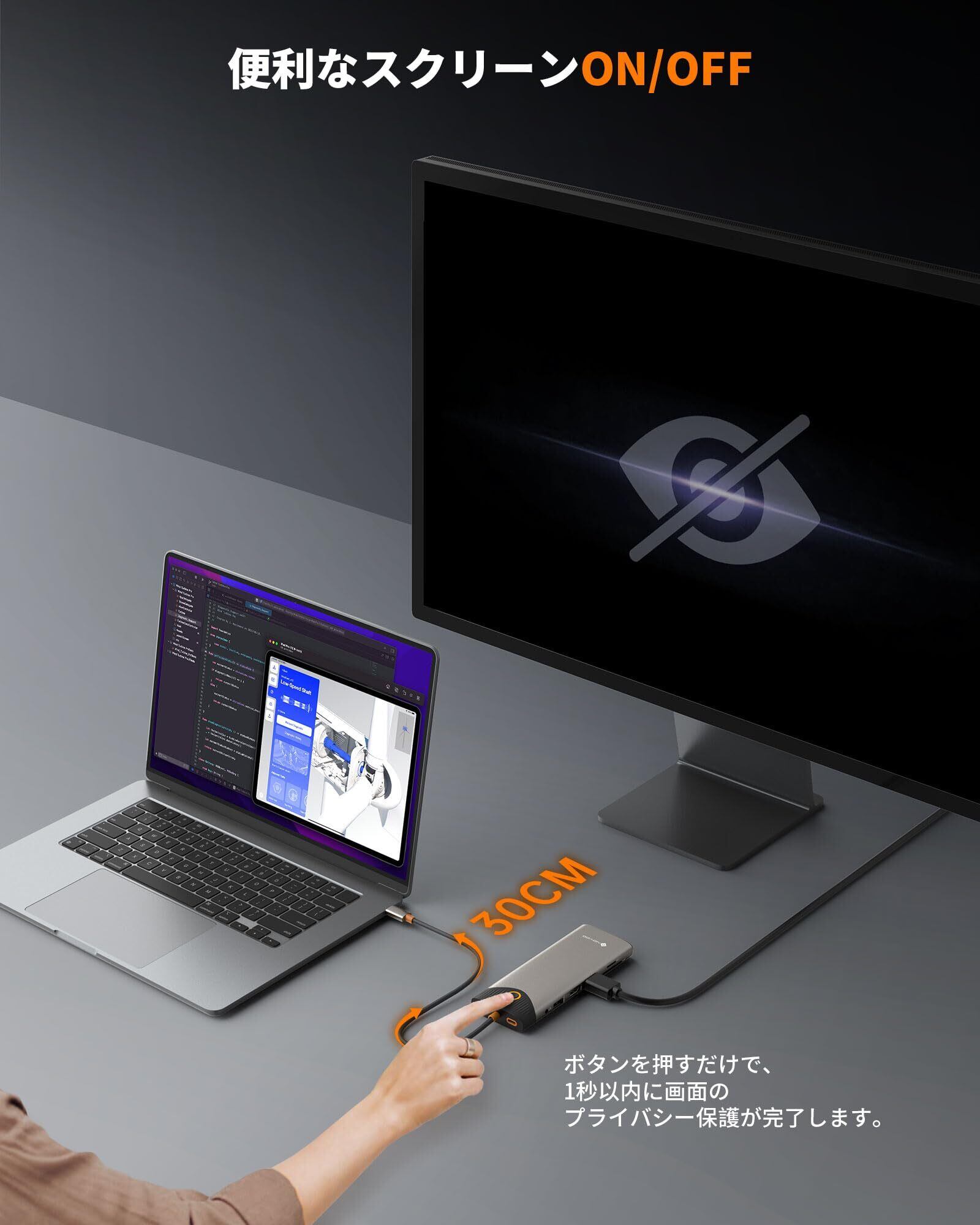 ワンクリック画面オフボタン: NOVOO USB C ドッキングステーションのON/OFFスイッチボタンは、表示を瞬時にロックして、機密データを保護します。プライバシーを重視するユーザーに最適で、ワークフローを中断することなく迅速にセキュリティを確保できます。オフィスやリモートワークにもぴったりです。