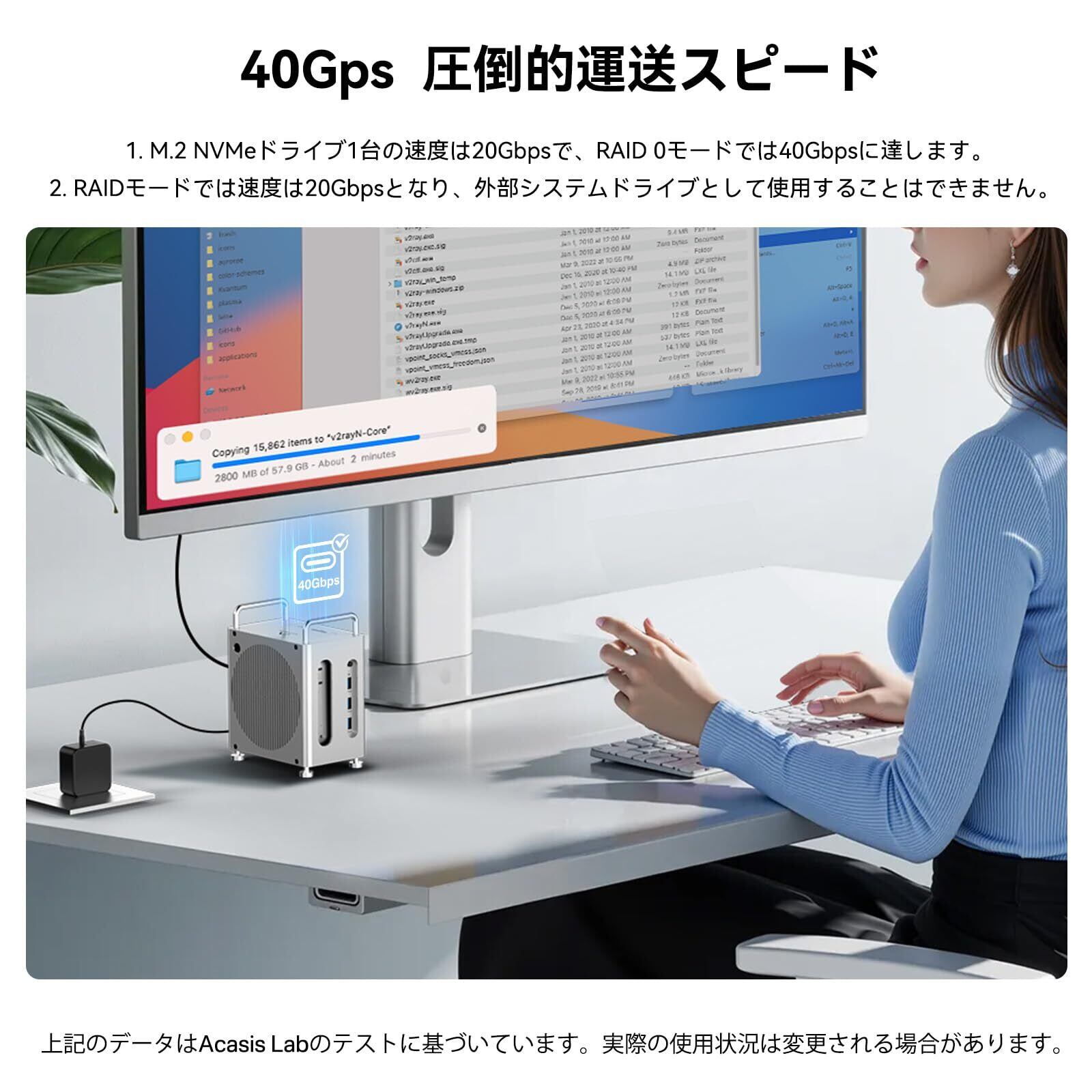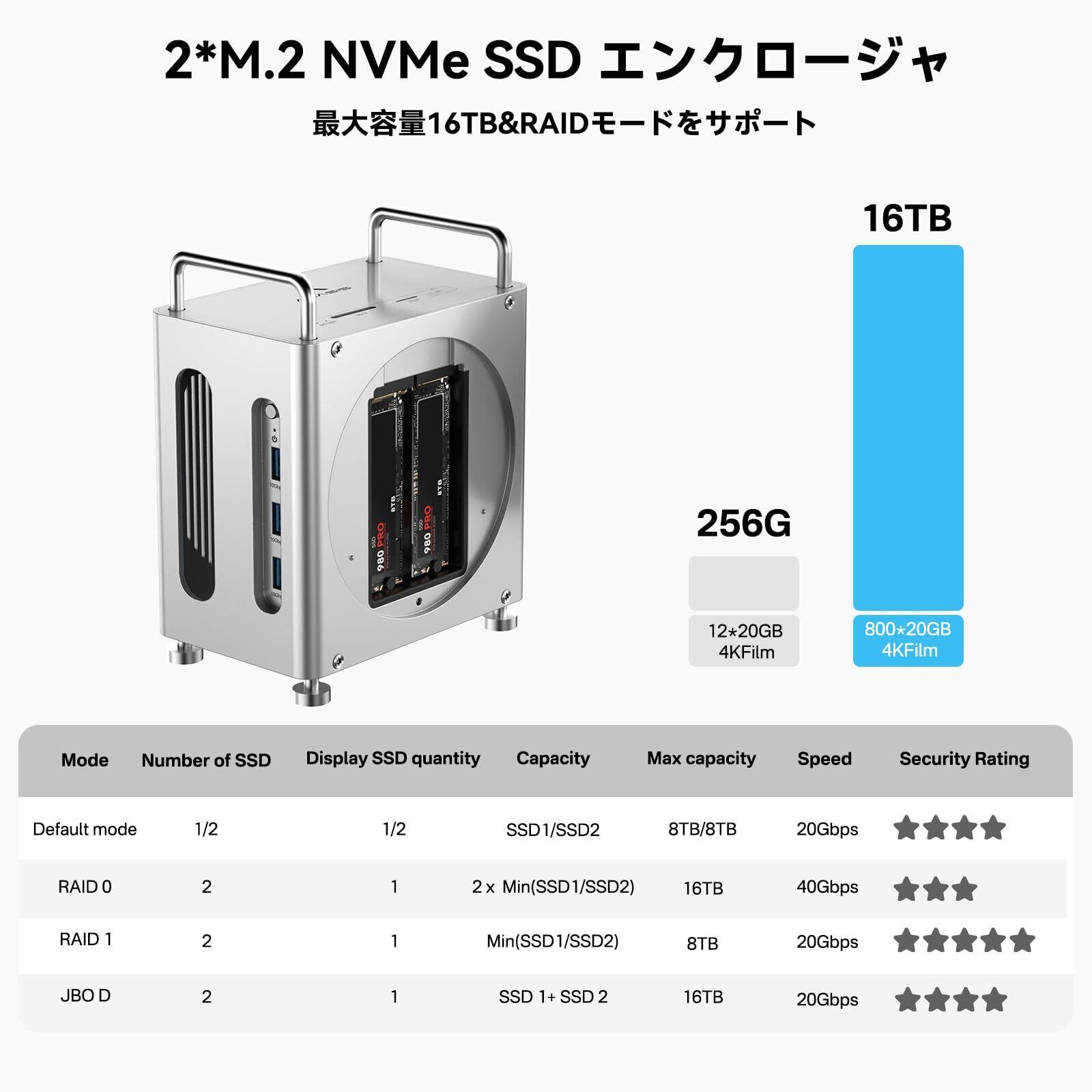 【【RAID 機能の 4 つの利点】RAID 0 (最大 40Gbps の速度)、RAID 1 (ミラー バックアップを提供、セキュリティ評価は )、JBOD、およびデフォルト モード (大容量ストレージ用に 16TB まで拡張可能) をサポートするこのデュアル ベイ SSD エンクロージャとドックで、究極のストレージ柔軟性を実現します。インテリジェント ストレージが効率とセキュリティを保護します。