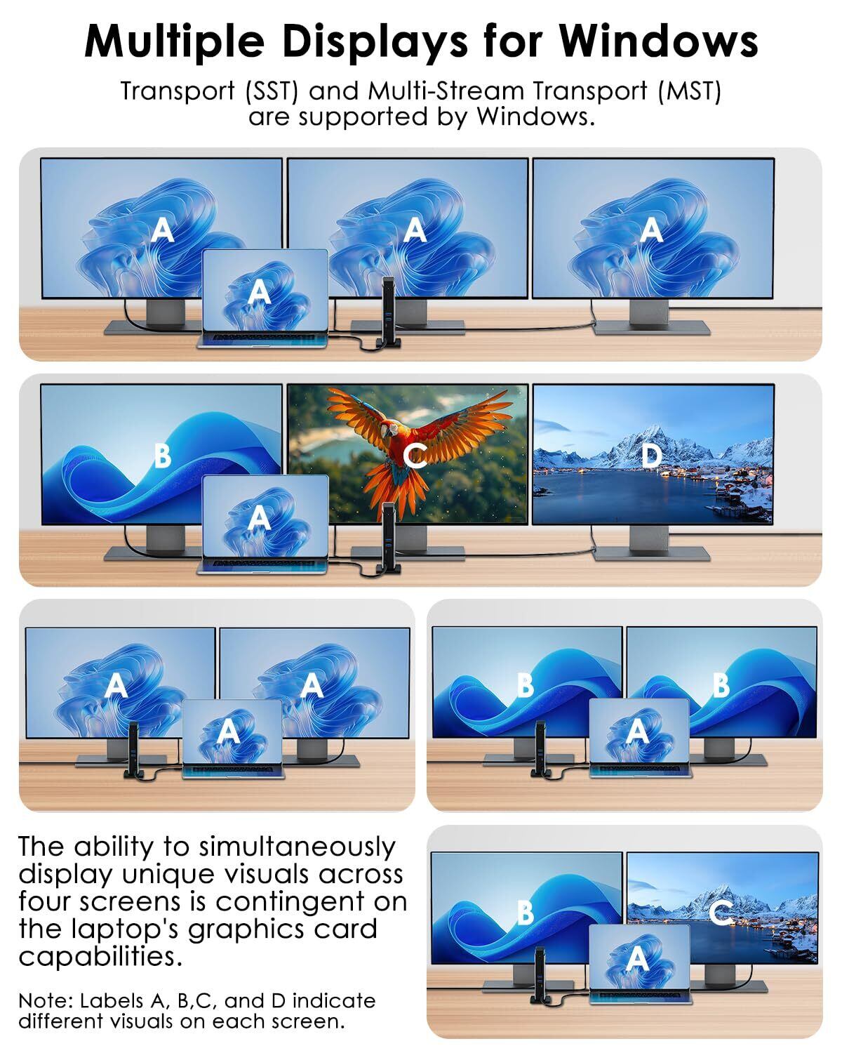 【使用上の注意】 ドライバ不要・接続するだけですぐ使用可能。macOSではMST(マルチストリーム転送)非対応のため、外部ディスプレイは1台のみ。Windowsでも機種により最大表示数に制限がある場合があります。①USB-CポートがOTGに対応しているか事前にご確認ください。②パソコンのType-Cポートが充電および映像出力に対応しているかをご確認ください。対応していない場合、充電や映像出力はできません。