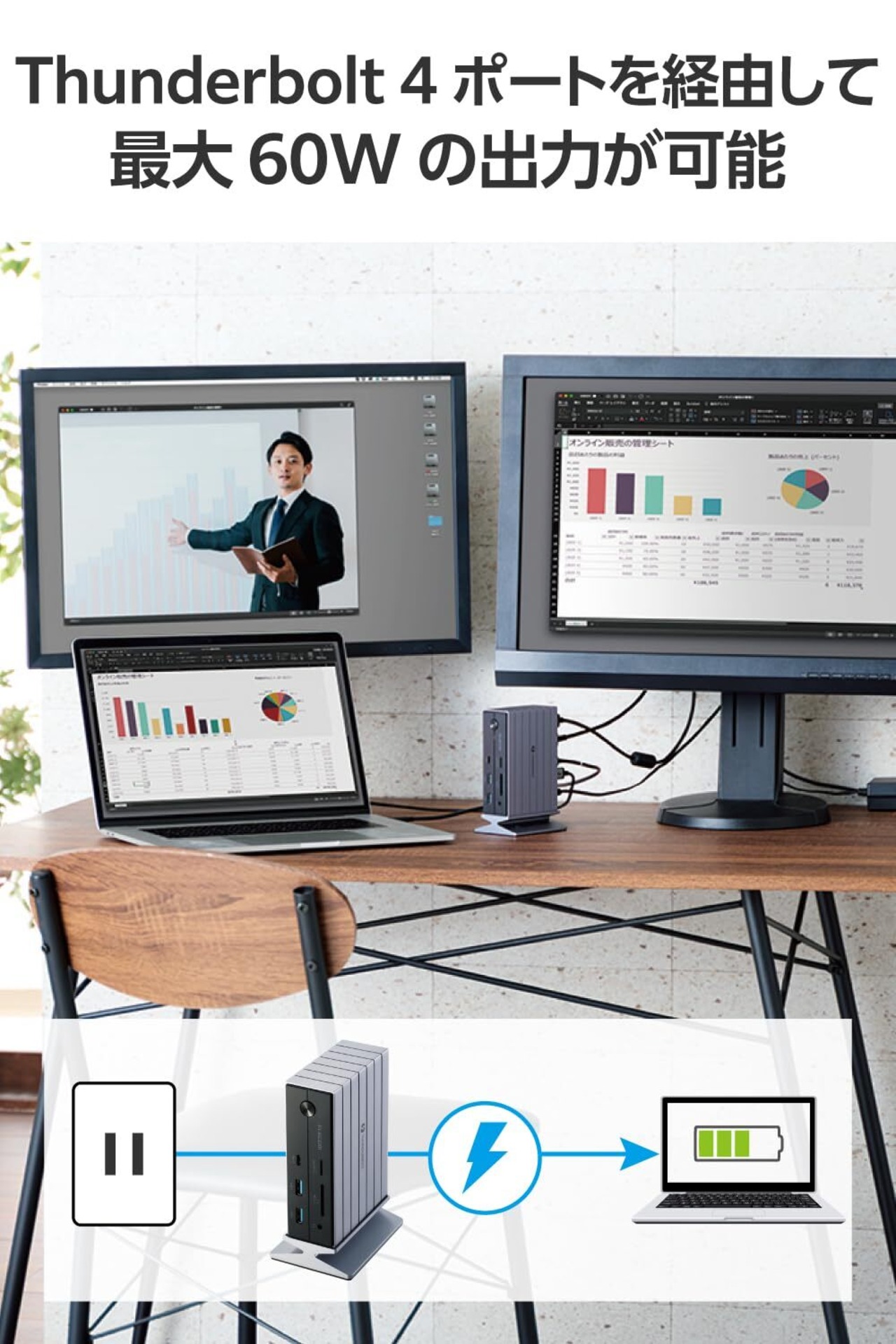 Thunderbolt 4ポート(アップストリーム)を経由して最大60Wの出力が可能。ノートパソコンへの充電が可能です。