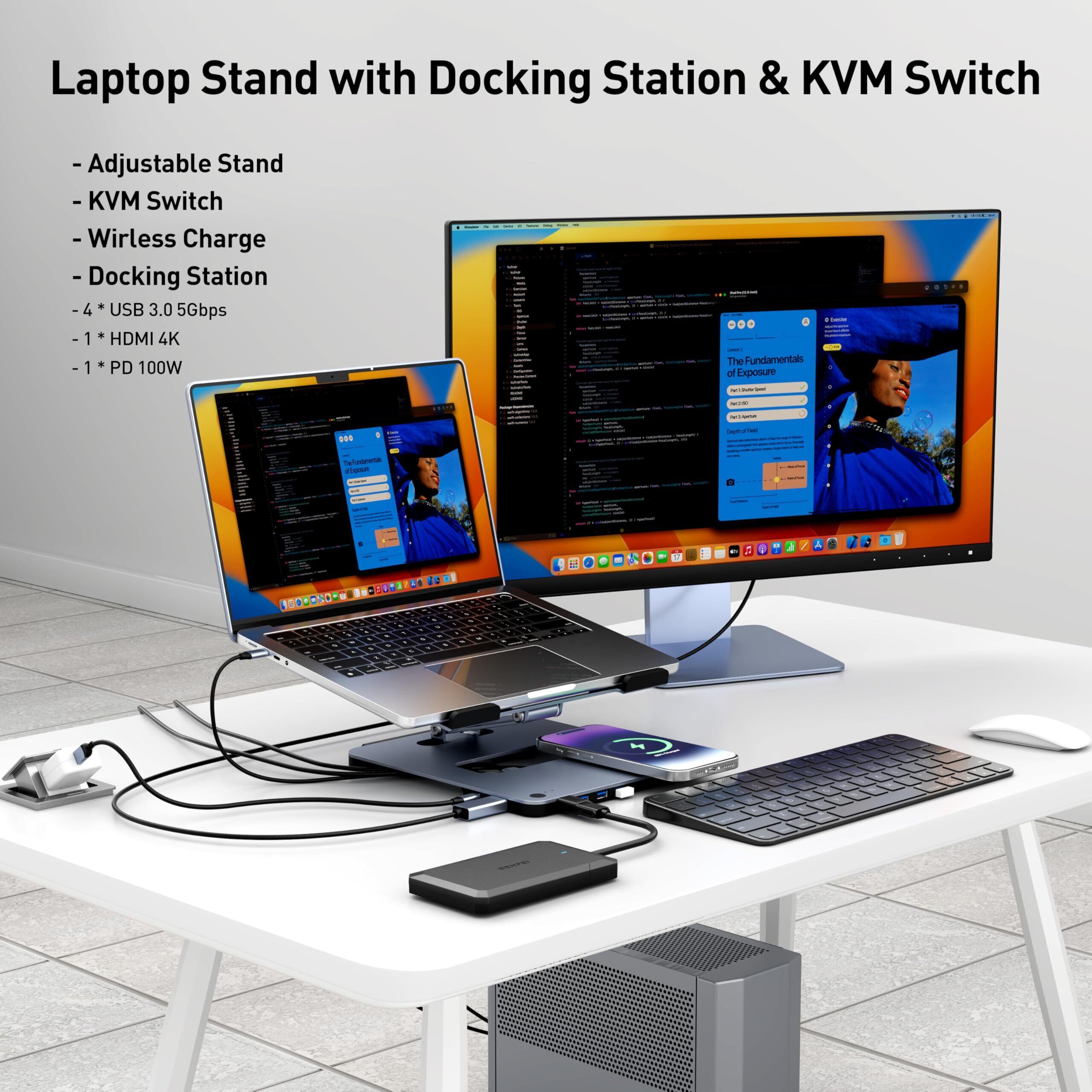 BENFEI ノートパソコンスタンド 6in1 USB-Cドッキングステーション 磁気ワイヤレス充電(15W) 対応 PD100W充電 HDMI 4K@60Hz USB3.0×4 KVM切替機能搭載 MacBook Pro/Air・iPad Pro・XPS・ThinkPad等マルチデバイス互換 コンパクト設計 アルミ合金製 作業環境を実現