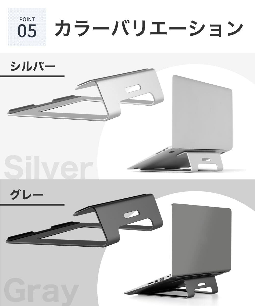高品質のアルミニウム製で作られており、軽量ながらも安定性が抜群です。滑り止め仕様の足部がしっかりとデスクにフィットし、使用中のぐらつきを防ぎます。安心してノートパソコンを使用できる環境を提供します。