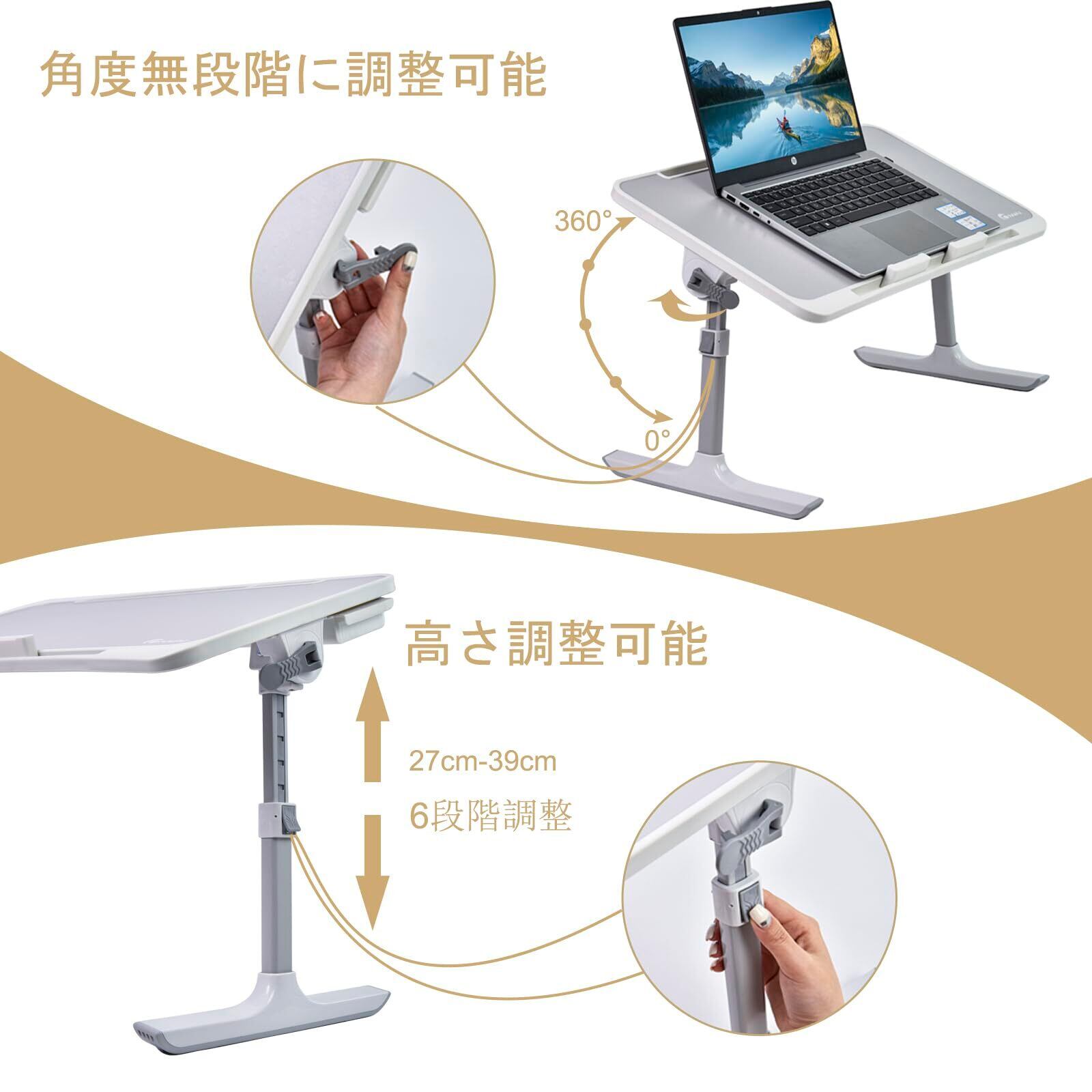 【高さ・角度調整】高さは、27~39cmの間で6段階調節可能。天板角板は、0~360°の間で無段階に調整可能。テーブルの両足は、八の字型デザインされ、最大幅61.5cmで、床、ベッドで使う時、足を楽に伸ばせ、胡坐などの姿勢をとる事もできます。