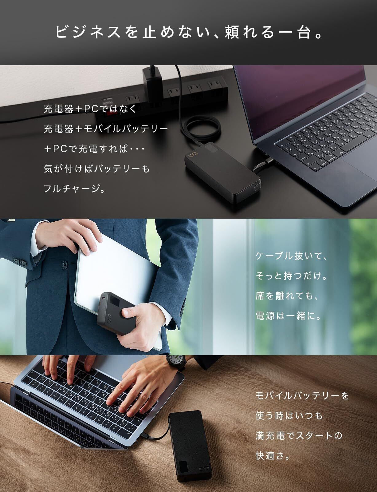 【ノートパソコンも充電できるモバイルバッテリー】SMARTCOBY Pro CABLEは単ポート最大100W、高出力でApple MacBook Pro 、パナソニック Let's note(レッツノート)といったハイエンドノートPCも充電可能なモバイルバッテリーです。大容量20000mAh搭載で、ノートPCを用いたミーティングを伴う出張など、充電環境に不安のあるビジネスシーンにおいておすすめです。