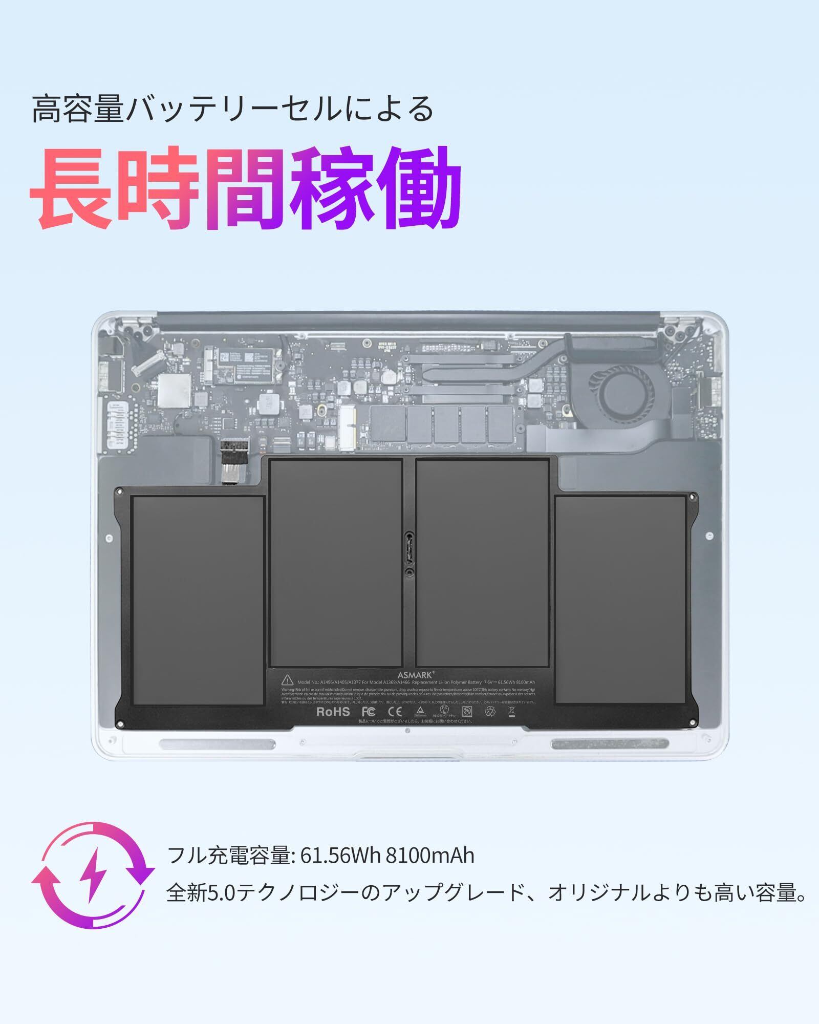 ■高性能で信頼性抜群の『ASMARK バッテリー』!このバッテリーは、MacBook AirシリーズのA1369およびA1466モデルに最適化されており、長時間の使用をサポートします。あなたのMacBookを常にパフォーマンス全開に保つために設計された、高品質な交換用バッテリーです。