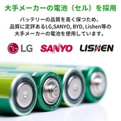 ◆日本独自の高い安全基準(PSE)に適合済。◆万全な防止機能:過電流保護・過充電防止・過放電防止、短絡保護などの機能付き。