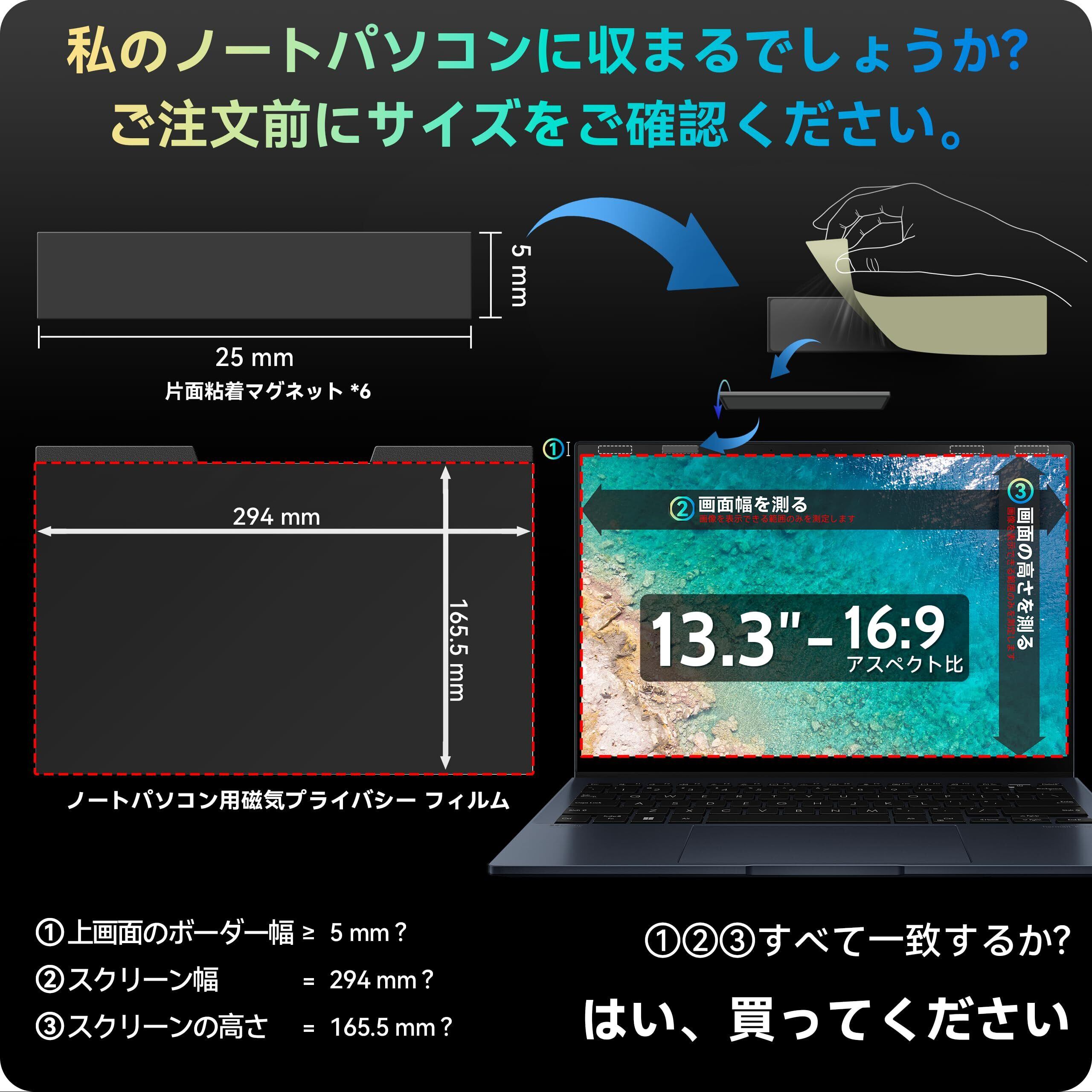 13.3インチ16:9マグネット覗き見防止フィルム、取り外し可能なブルーライトカットアンチグレアスクリーンフィルター、13インチノートパソコン用の磁石ぞき見防止
