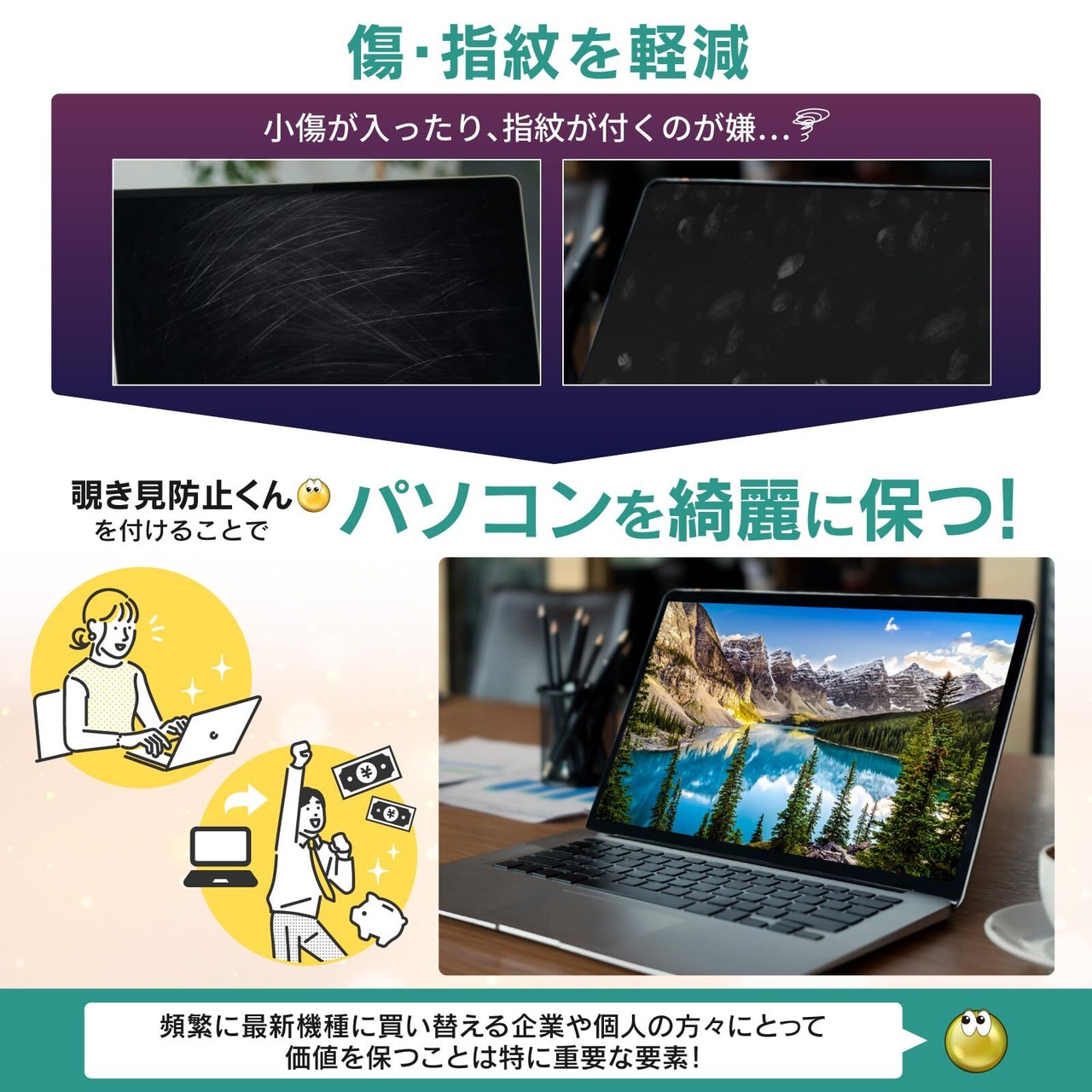本フィルターは、左右30度以上の角度からは画面が真っ黒に見える設計で、プライバシーをしっかり守ります。また、ブルーライトを約30%カットし、長時間の使用による目の疲れを軽減します。さらに、紫外線も99.9%カットし、目の健康を保護します。