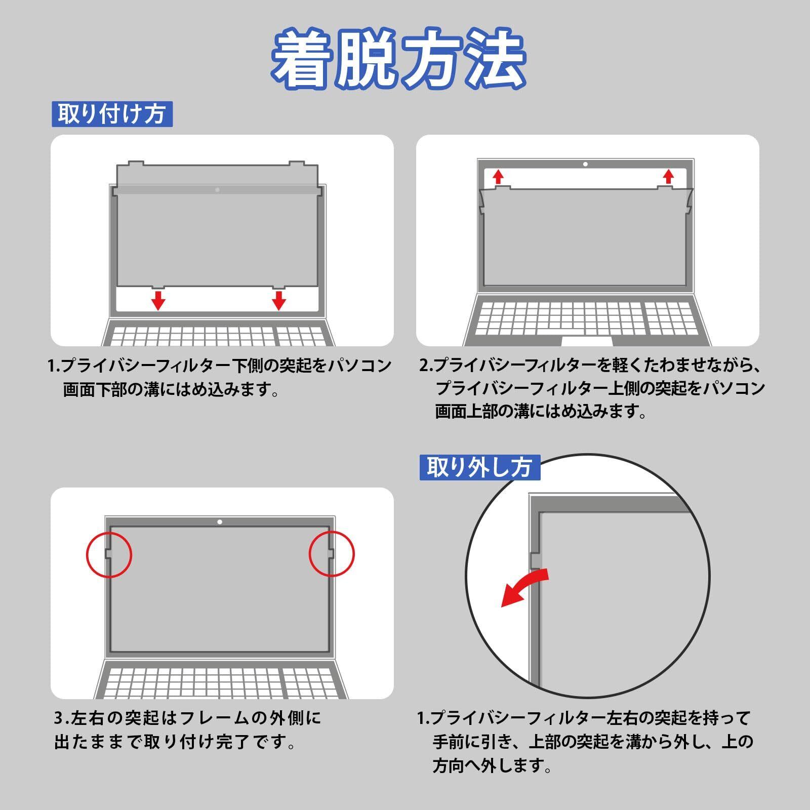 【取付け簡単】フィルターの上部と下部にある突起をレッツノート CF-SC / CF-SRシリーズパソコン画面の溝に差し込むだけで、簡単に装着できます。また、フィルター左右のつまみを手前に引くことで、簡単に取り外すことができます。※2023年10月にCF-SRシリーズのサイズにぴったり合うよう調整を行いました。