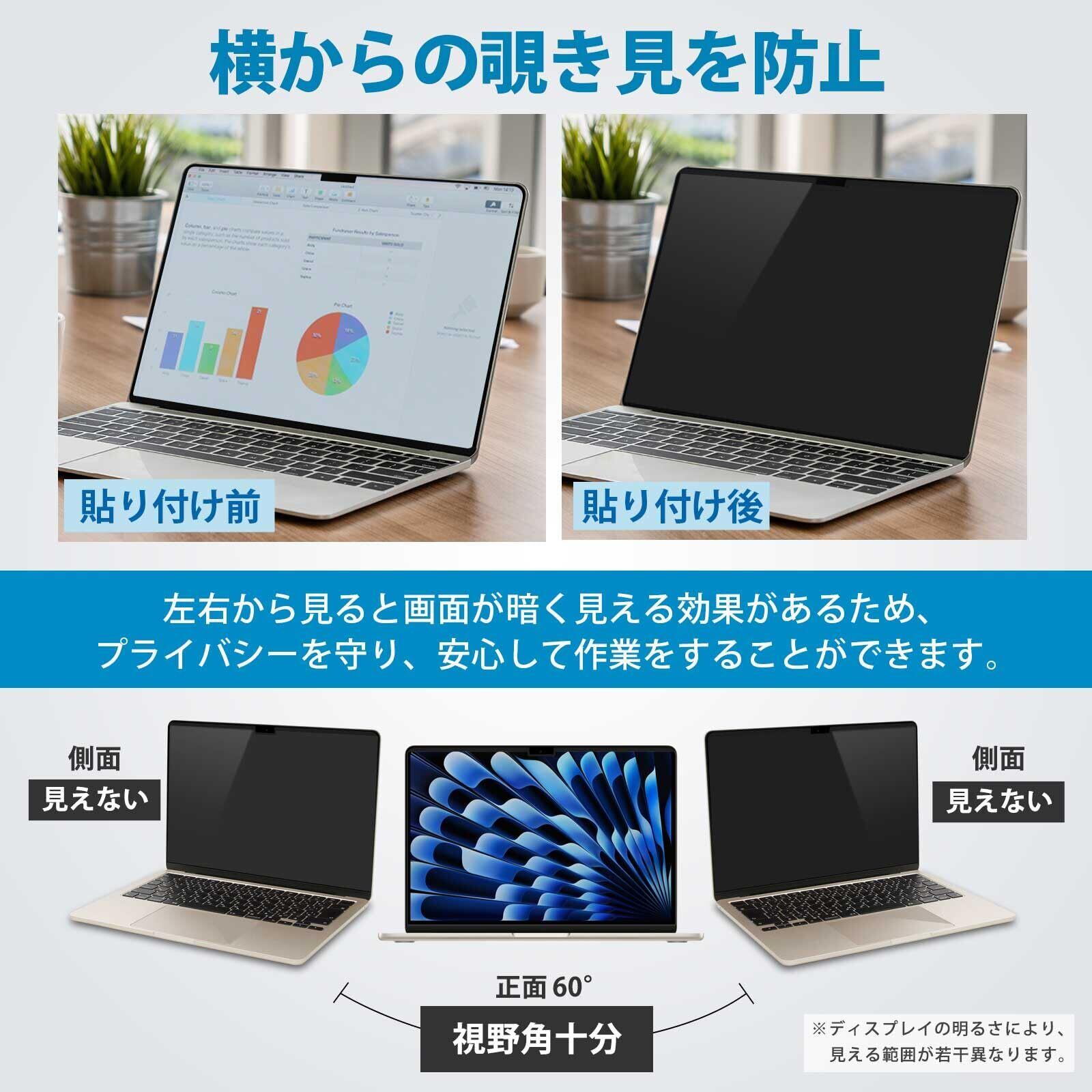 プライバシー保護:正面からの視認性を保ちつつ、側面からの覗き見を防ぐことができます。約60度の視野角(左右30度)を越えると、画面が暗く表示されるため、新幹線やカフェで作業をしていても情報の漏洩リスクを回避することが可能です。