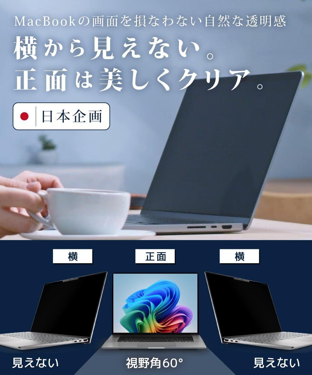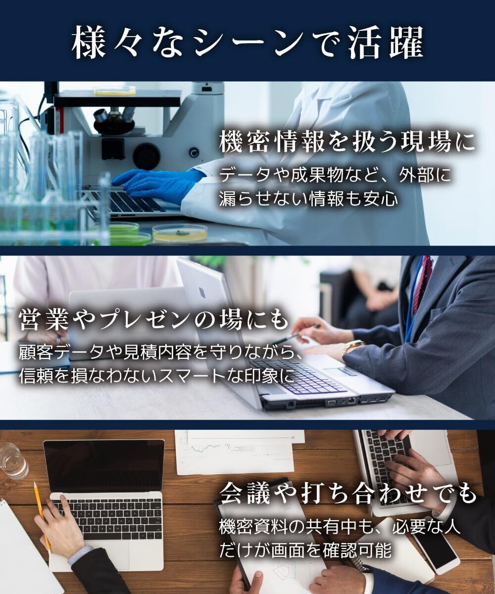 [プライバシー保護] 視野角 60度、正面から見れると画面はクリアでも、隣の席からは真っ暗に映る偏光性を有する「覗き見防止フィルター」です。