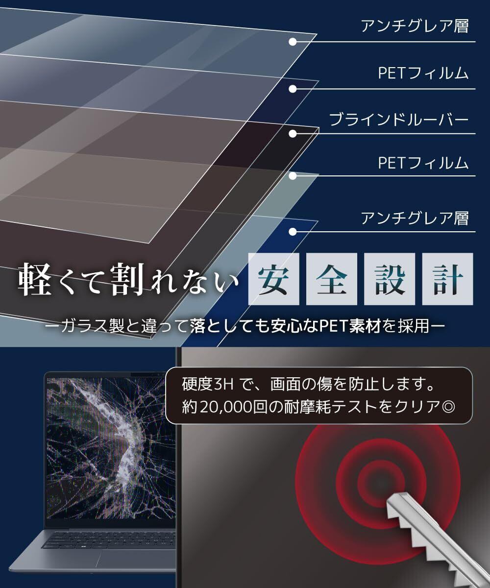 [ ブルーライト半減 ] 私たちが子供の頃にはなかったノートパソコンのスクリーンから発せられる青色光。 毒性の強いブルーライトは眼精疲労や体内リズムへの影響が益々懸念されています。 本製品はブルーライトを約50%低減。将来のことを考えるならブルーライトカット対応フィルムがオススメです。