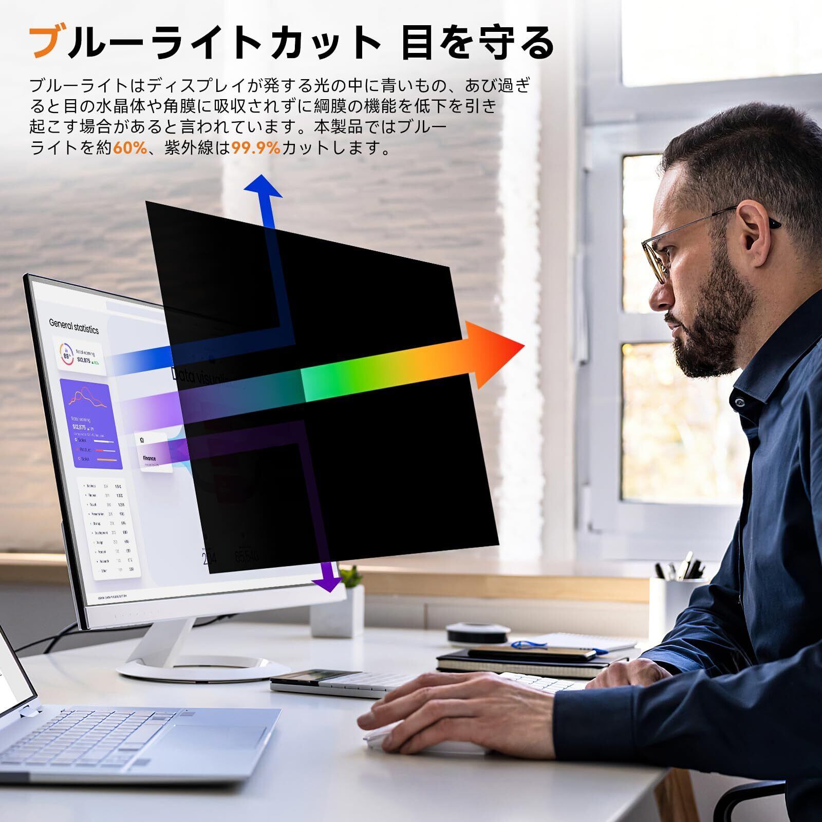 【ブルーライトカット】覗き見防止フィルターは独自開発のブルーライトカット素材を採用して、LED液晶ディスプレイが発する光の中の青い部分「ブルーライト」を約60%カットします、有害な紫外線からを99.9%ガードします、有効的に目の疲れを軽減します。