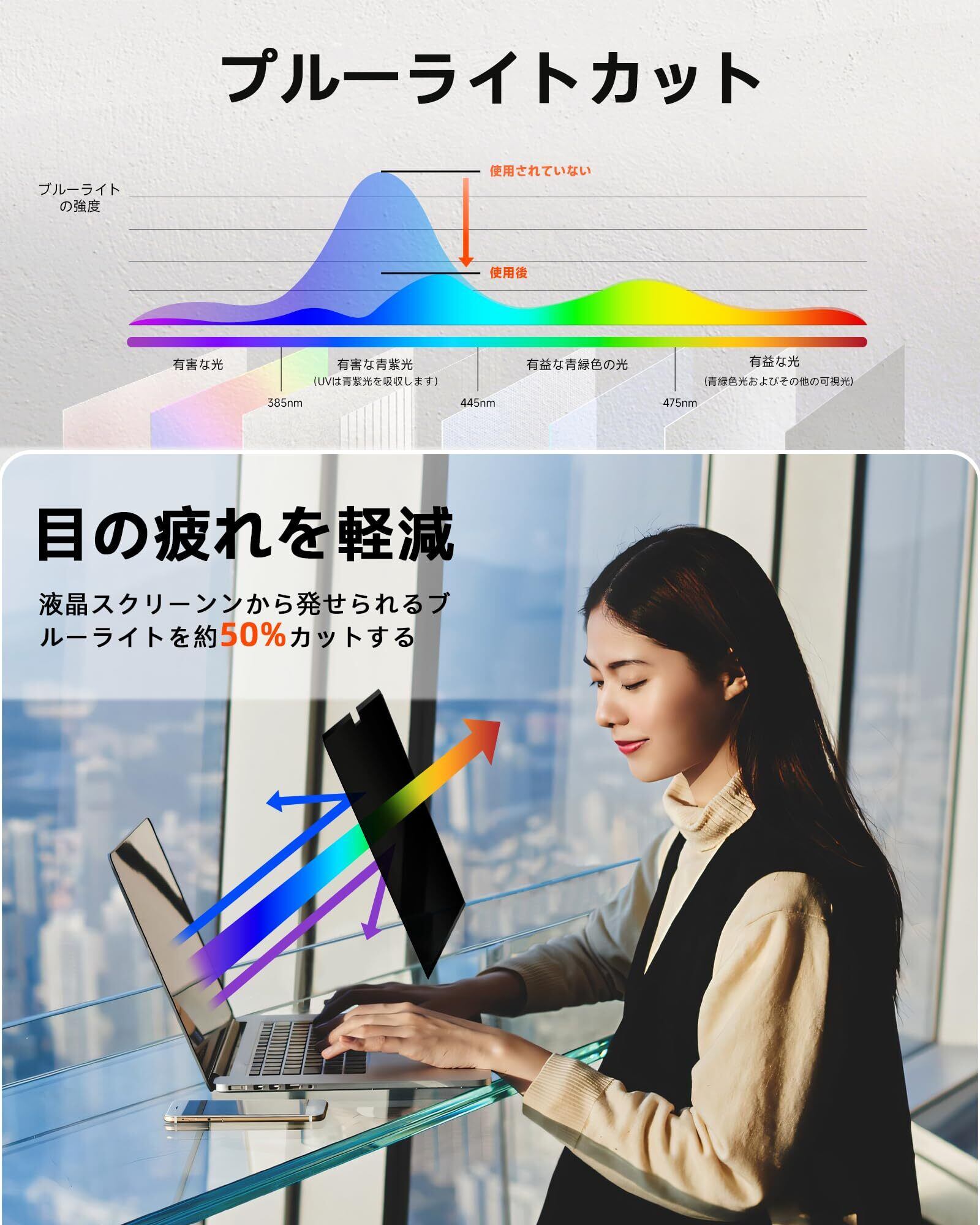 【ブルーライトカット・反射低減】長時間にパソコンのスクリーンから発せられる有害光線を浴びると目の疲れ、ドライアイ、睡眠が乱れるなど体へ影響が益々懸念されています。本プライバシーフィルムは青色光と紫外線カット機能を備えて、ブルーライトを約50%低減し、使用者のプライバシーを守るだけではなく、目も守