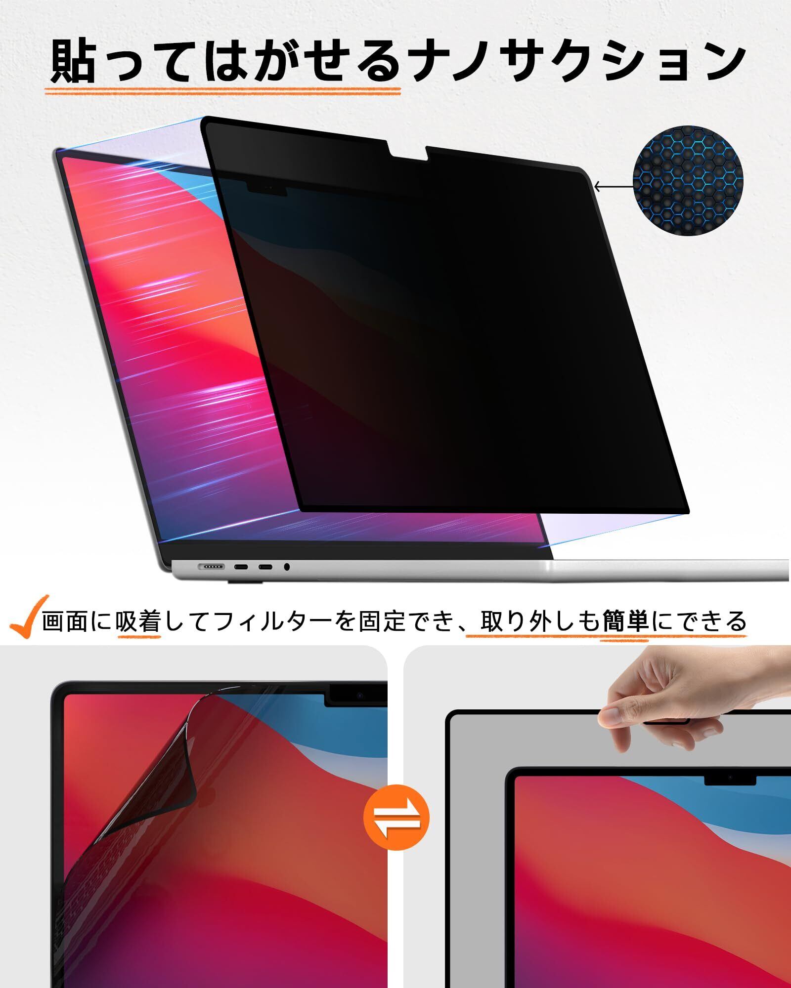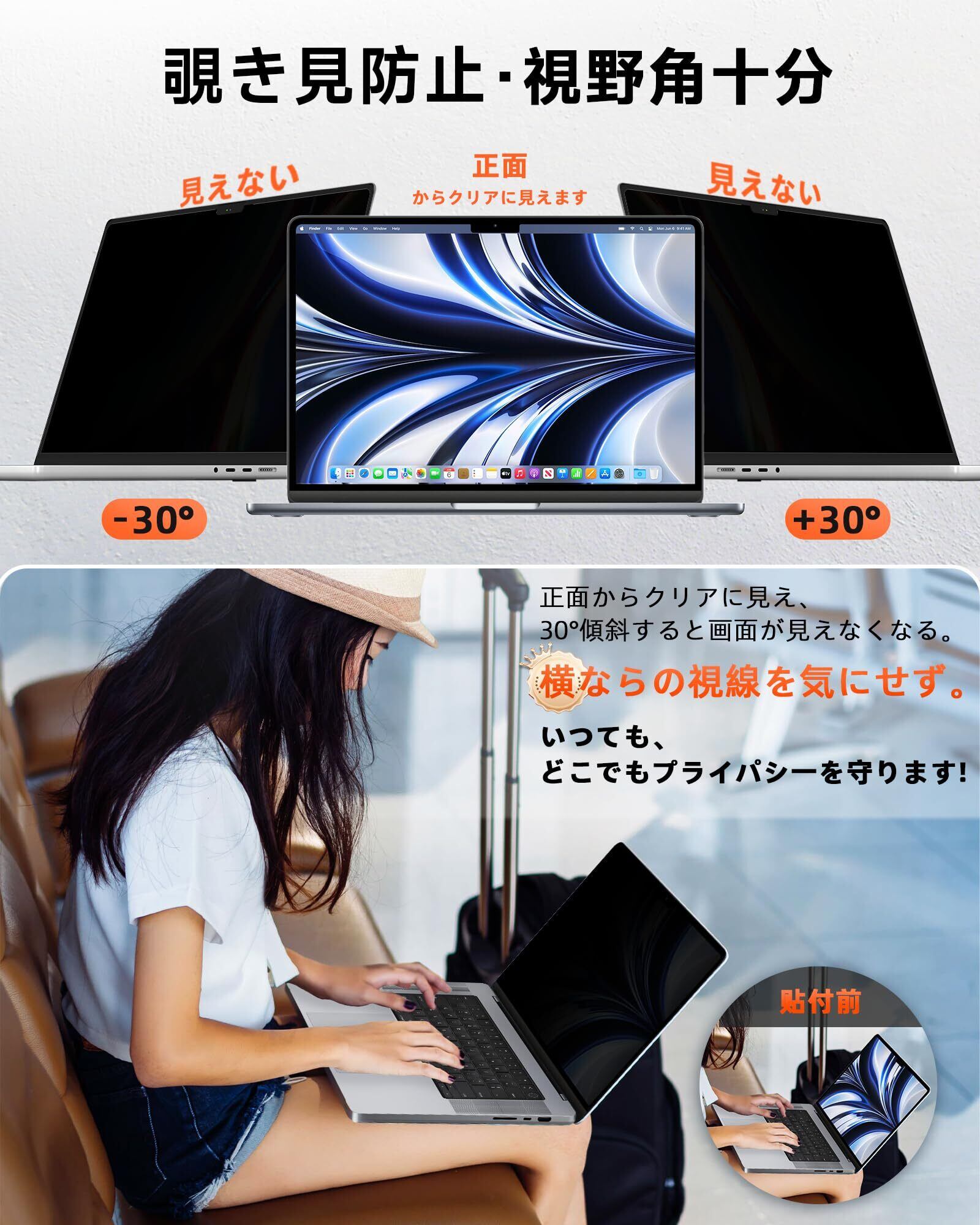 MacBook Air 13.6 M4/M3/M2 2022-2025用 覗き見防止フィルター ナノサクション式 吸着式 プライバシーを守る 保護フィルム 粘着タイプ ブルーライトカット のぞき見防止フィルム 反射防止 キズ防止 両面使用 着脱簡単 Mamol