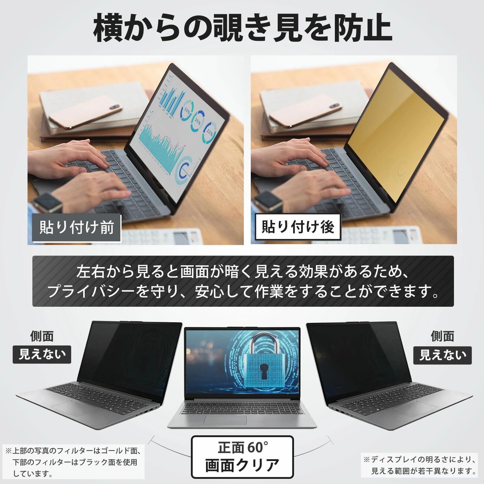 【プライバシー保護】 高精度「覗き見防止フィルター」により、視野角を±30°に制限。正面からは鮮明な画質を維持しつつ、横からの視線を完全に遮断します。オフィスや公共スペースでの安心感を提供。