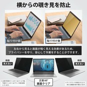 このフィルターは、片方が覗き見防止機能を持つアンチグレア加工で、もう片方はクリアな面となっています。あらゆるシーンで用途に応じて簡単に切り替えることができるので、大変便利です。