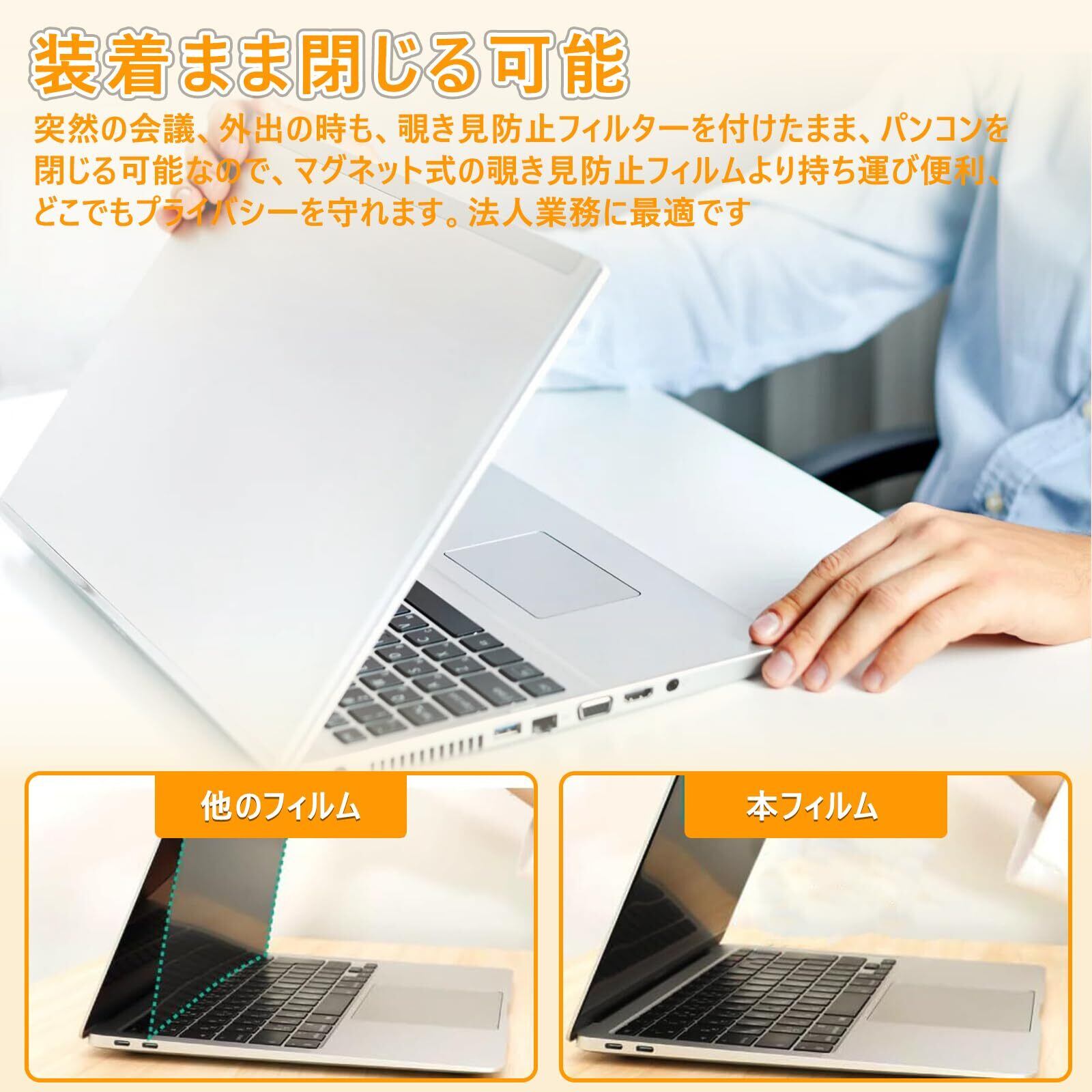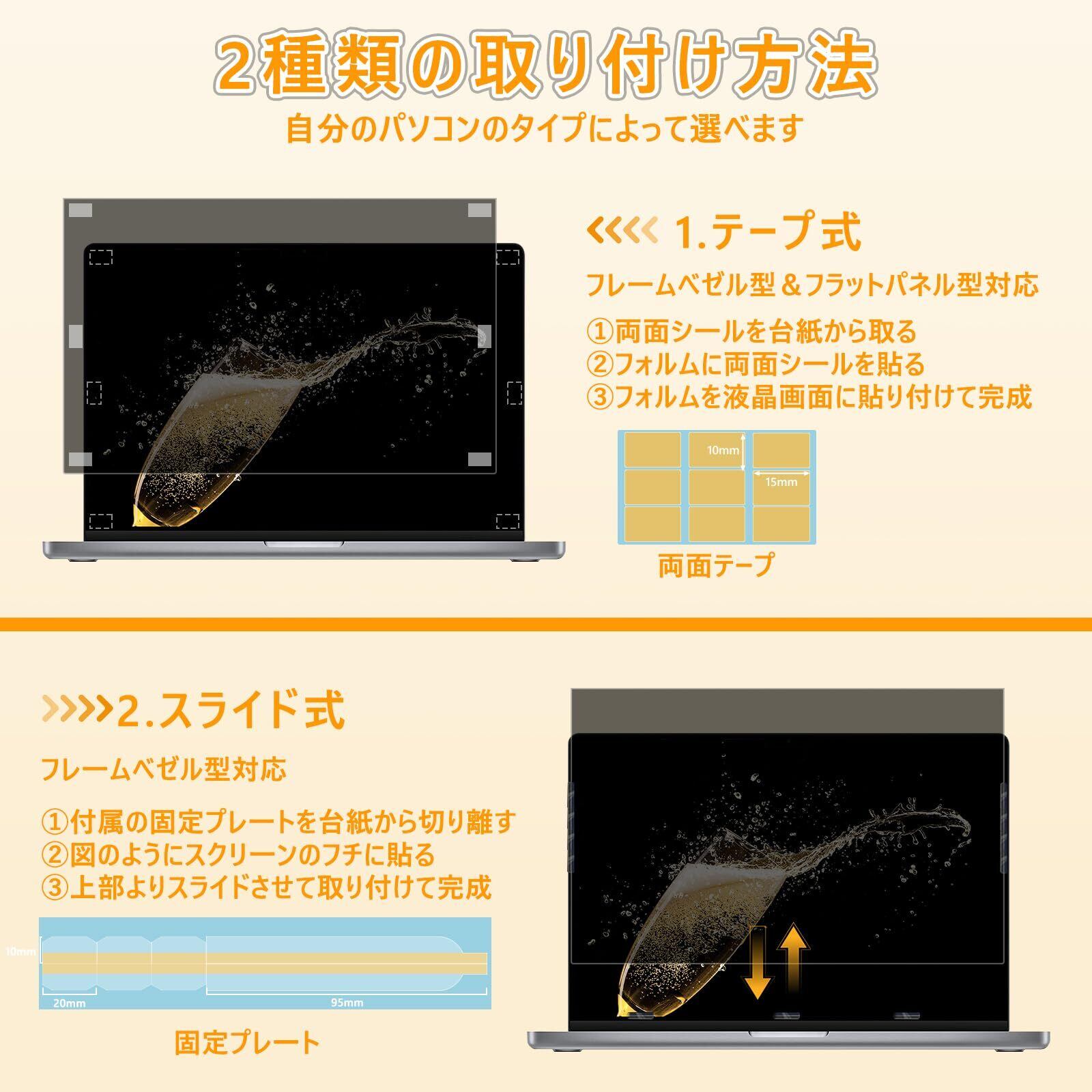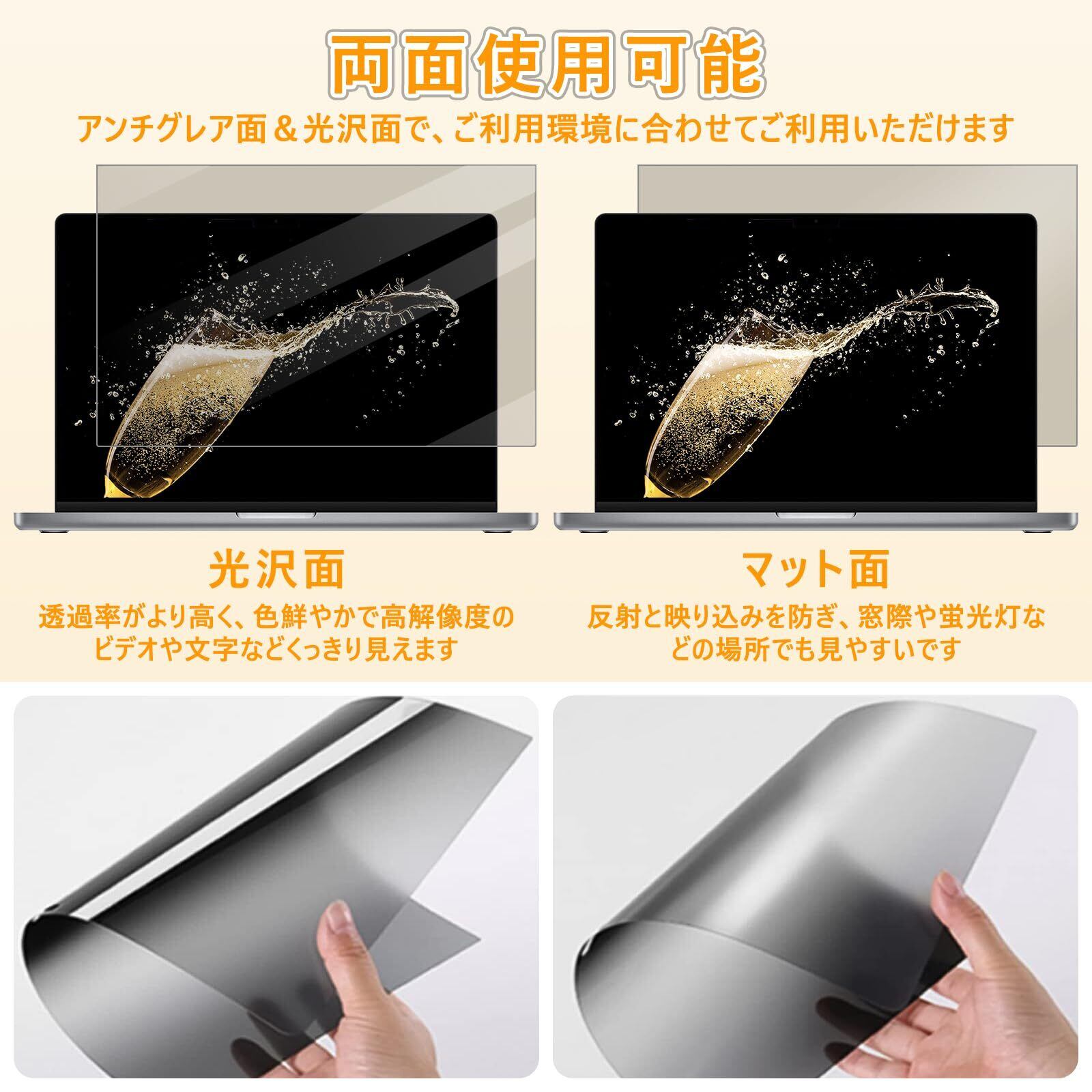 【両面使用可能】 両面使用できる覗き見防止フィルターです。光沢面は透過率がより高く、高解像度のビデオや画像の視聴に適しております。もっと鮮明な映像を楽しみたい場合は光沢面をご使用ください。もう片面(非光沢面)はマットな質感で、反射防止加工となっておりますので、蛍光灯などの反射を軽減できます。窓際や蛍光灯の多い場所などでマット面をご使用ください。表面の違いがありますけど、どちらの面も覗き見防止効果は変わらないです。ご利用環境に合わせてご利用いただけます。※ご注意:本フィルムを取り付けた後、画面が暗くて見づらいと感じる場合はパソコンの明るさを調整して下さい。